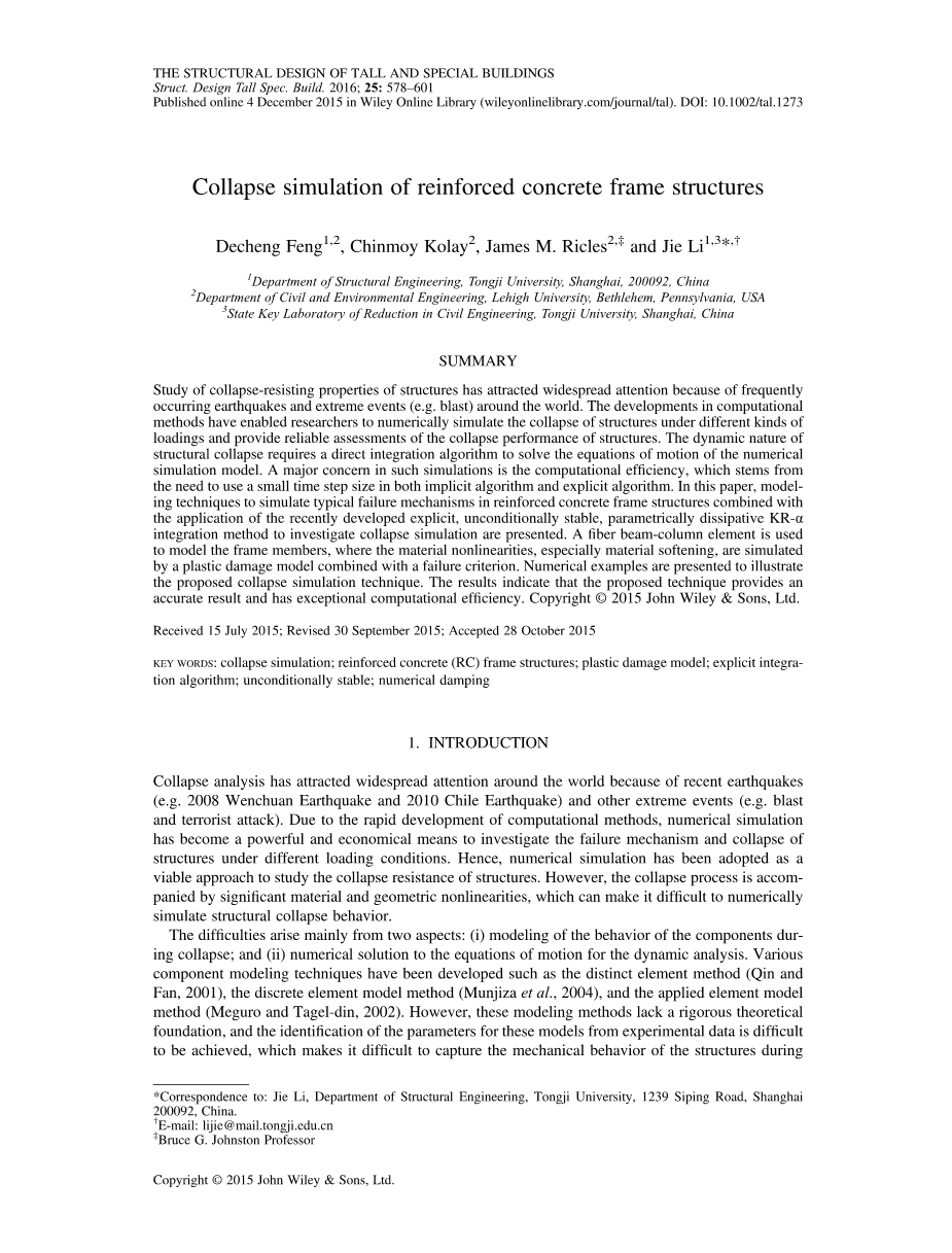 Decheng Feng1,2,Chinmoy Kolay2,James M. Ricles2,Dagger; 和Jie Li1,3*,dagger;