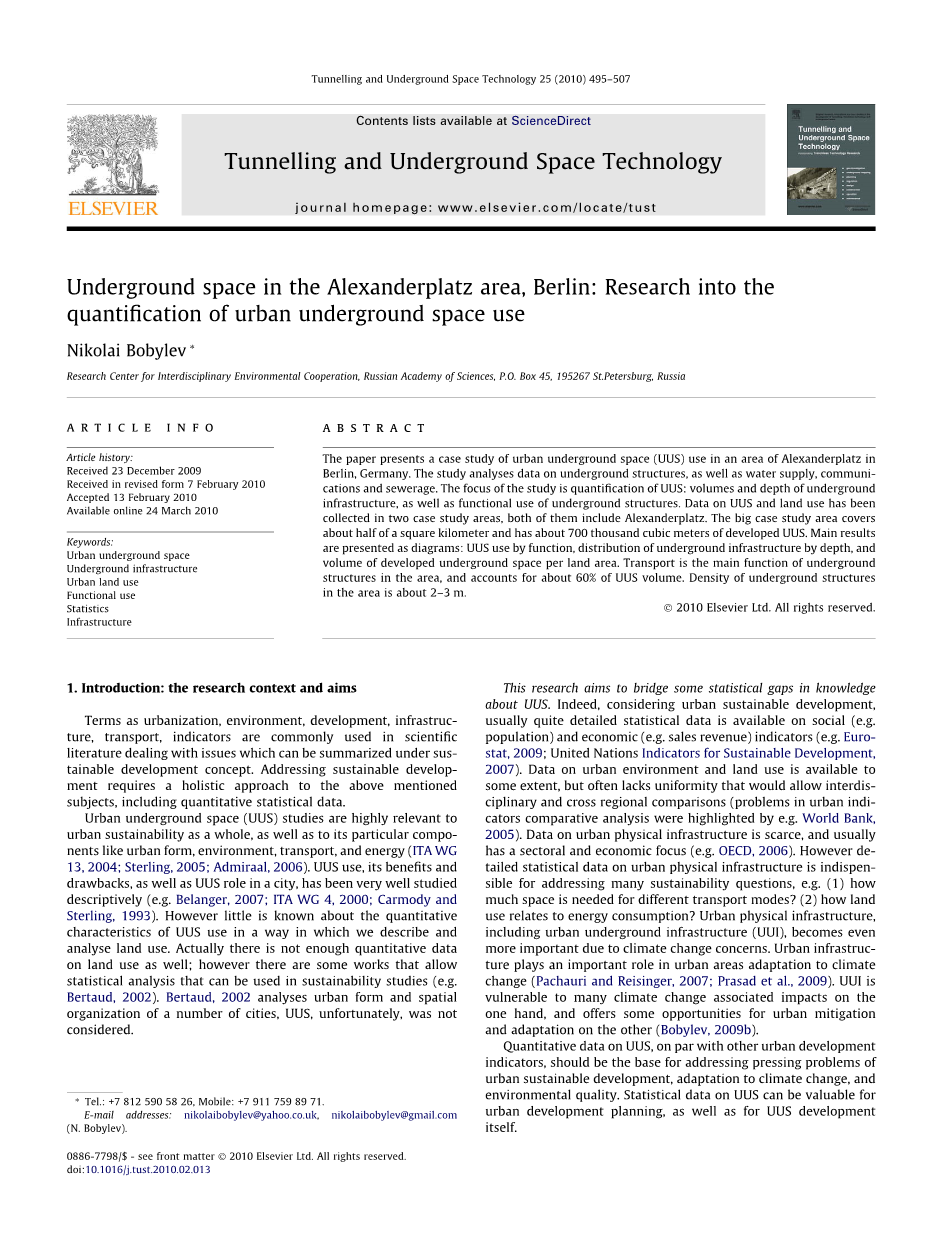 城市地下空间(UUS)的研究,对城市可持续发展的高度相关,作为一个整体,以及其特定的组件如城市形态、环境、运输、能源(ITA WG 13, 2004; Sterling,2005;Admiraal,2006)。UUS的使用,其优点和缺点,以及UUS在城市中的角色,都经过了很好的描述性研究(如Belanger,2007; ITA WG 4,2000; Carmody 和 Sterling,1993)。 然而,我们对使用UUS的量化特征知之甚少,并且没有以我们描述和分析土地利用的方式。 实际上,土地利用方面的定量数据还不够多, 然而有一些作品可以用于可持续性研究的统计分析(例如Bertaud,2002)。 Bertaud,2002分析了一些城市的城市形态和空间组织,UUS不幸未被考虑。