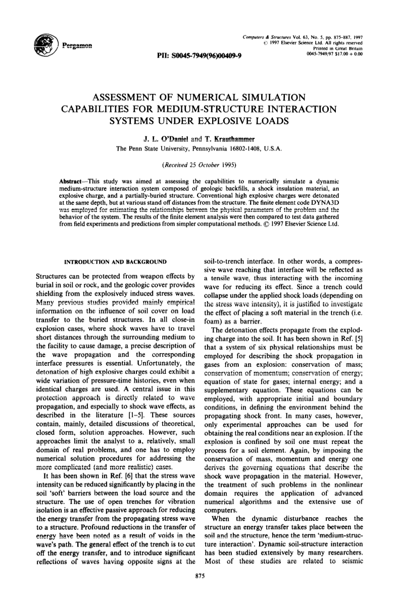 摘要----该研究致力于评定数值模拟的一个动态介质-结构相互作用系统的承载力。此系统由地质回填土、隔绝冲击材料、爆破炸药和部分掩埋结构组成。常规的高爆破性炸药在同一深度但与结构的不同距离处引爆。有限元软件DYNA3D用来评估问题的物理参数和系统的性状之间的关系。有限元软件的分析结果随后与现场试验收集的实验数据和通过简单计算方法得出的预测进行比较。