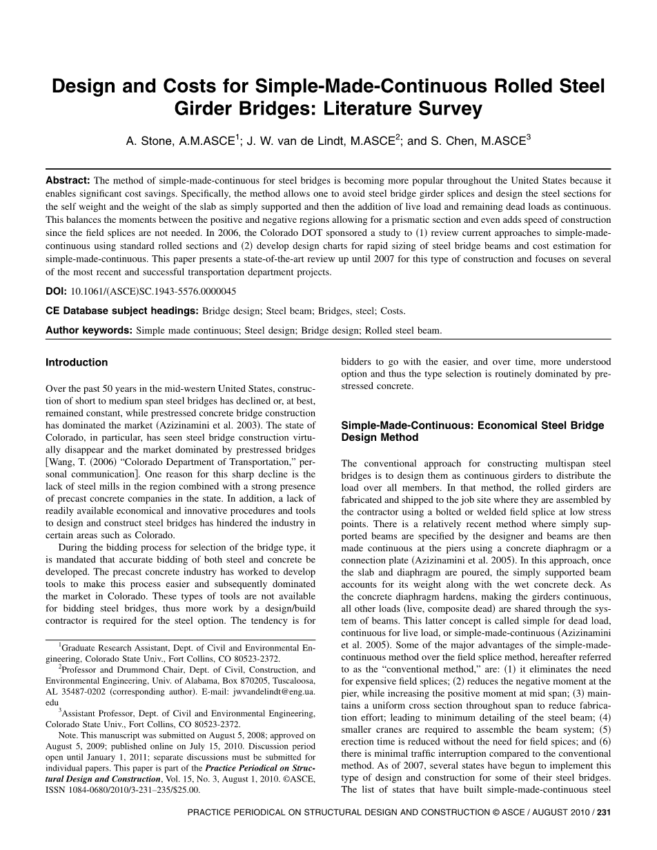 研究表明,在桥梁设计规范中规定的梁分布系数(GDFs)是不准确的。特别要注意的是,GDFs 似乎限制了对较大的跨度和梁间距的影响,但是对短的跨度和梁间距太容许了。因此,对大约20座跨度达到45米的钢梁桥进行了现场测试。通过每个结构测试,GDFs 是由在梁体加载重型卡车后测量出的应变所决定。测试卡车是轴重11t的车辆,载荷达到了密西根州的法律限制(超过650kN)。记录的应变,分别为一辆卡车单独行驶和两辆卡车并行时的。这些测试都是重复在爬行速度和正常行车速度的位置。在所有的被测试桥中,现场观测所确定的GDFs均低于规范规定值。此外,这些桥梁使用商业有限元软件ABAQUS进行了分析。分析结果和现场试验测定值进行了比较。观察到应变的最大值和相应的应力均低于利用 ABAQUS 分析所获得的值。这种差异的原因是由意想不到的复合作用和局部稳定性所证实的(而不仅是简单的支持)。
