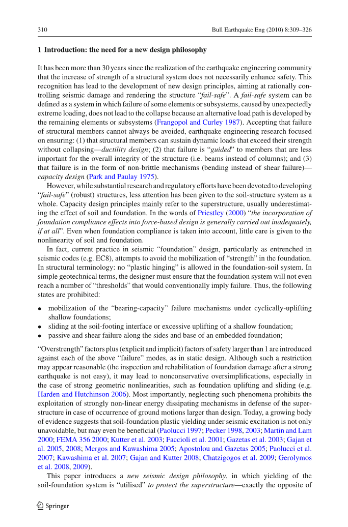 然而,虽然大量的研究和监管工作致力于发展“故障安全”(偏安全)结构,但对整个土体结构系统的关注却不大。能力设计原则主要是指上层建筑,通常低估土体和基础的影响。用普里斯特利(Priestley,2000)的话来说,“将基础合规效应纳入基于受力的设计通常无法完成”。即使考虑到基础的依从性,对土体和基础的非线性也没有多少关注。