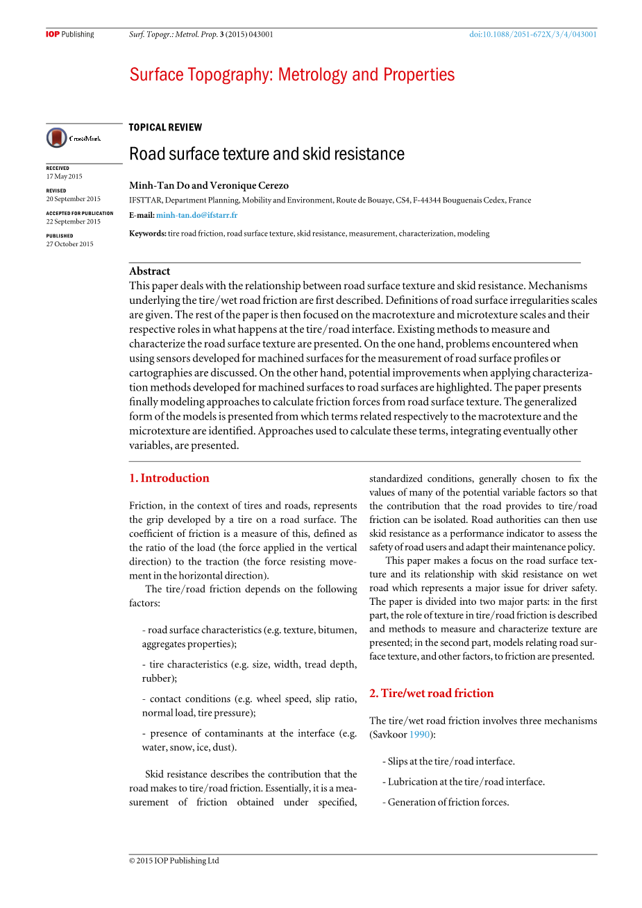 关键词:轮胎路面摩擦,路面结构,抗滑性,测量,表征,建模 1