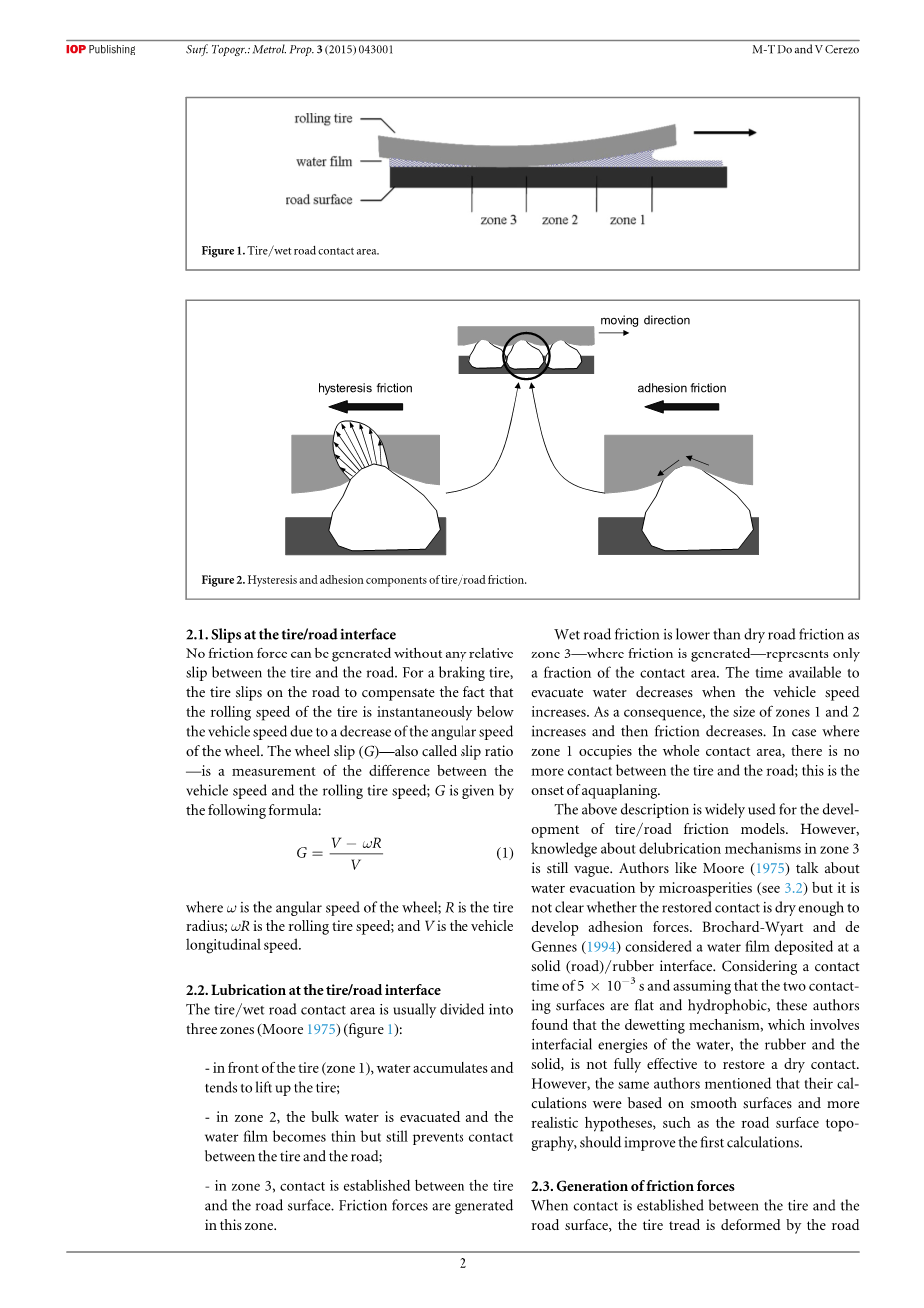 一旦散装水被宏观结构疏散,它仍然是一个薄膜(厚度为0.1毫米或更少)在2区(图1),并且在在区域3(图1),在凹凸的顶部有水袋。这些残余水膜的挤压只能通过形成微结构的角状凸起施加的高压来实现。通过轮胎橡胶与路面微观结构之间的相互作用产生摩擦力。