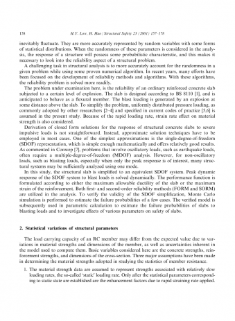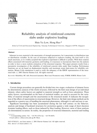 每种材料固有的是强度参数的不确定性,无论是分布类型的不确定性或分配变量。在受到爆炸载荷的结构的情况下,载荷本身非常大很不确定,因为人们普遍认为爆炸性实验很难预测。随便这些与材料,何形状和载荷相关的效果,有必要将它们纳入分析中为了更准确地估计结构响应。本文介绍了一个结果爆炸荷载作用下钢筋混凝土板可靠度参数研究。性能基于位移延性和最大应变极限状态建立功能,用于可靠性估计。蒙特卡罗模拟用于验证结构的SDOF表示的充分性板。 2001 Elsevier Science Ltd.保留所有权利。
