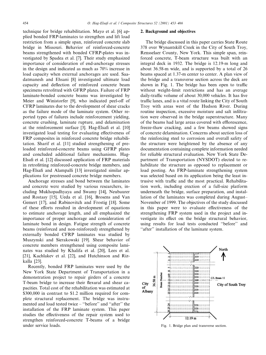 本文中所讨论的桥位于纽约伦斯勒县南特洛伊市温纳特里克河上的378号公路。这个钢筋混凝土简支T梁结构是1932年建立的桥长12.19m,宽约36.58米,由26根梁在1.3-7米的中心与中心隔开。图1显示了桥面和横跨甲板的横截面的平面图。这座桥在没有重量限制的情况下已经通车,平均每天的交通量约为30000辆。它有五条车道,是连接南特洛伊城和哈得逊河以西地区的重要路线。在常规检查中,桥梁上部结构中观察到过多的水分和盐分浸润。许多梁的大面积覆盖着风化、冻融开裂,少数梁表现出混凝土分层的迹象。由于没有可靠的结构评估所需的完整信息的任何文件,提高了钢筋的截面损失对腐蚀和结构的整体安全性的关注。纽约州运输部(NYSDOT)选择重新配置该结构,而不是替换或装载过帐。基于FRP层压板加固系统的应用是最不受交通影响的,是最实用的。修复工作,包括在桥下架设一个全尺寸的平台,在1999八月至十一月期间完成了层合板的表面准备和安装。本文的研究目的是评估在工程中使用的加固FRP系统的有效性,并研究其对桥梁结构行为的影响,得到使用荷载试验在使用前后进行层压系统安装的结果。