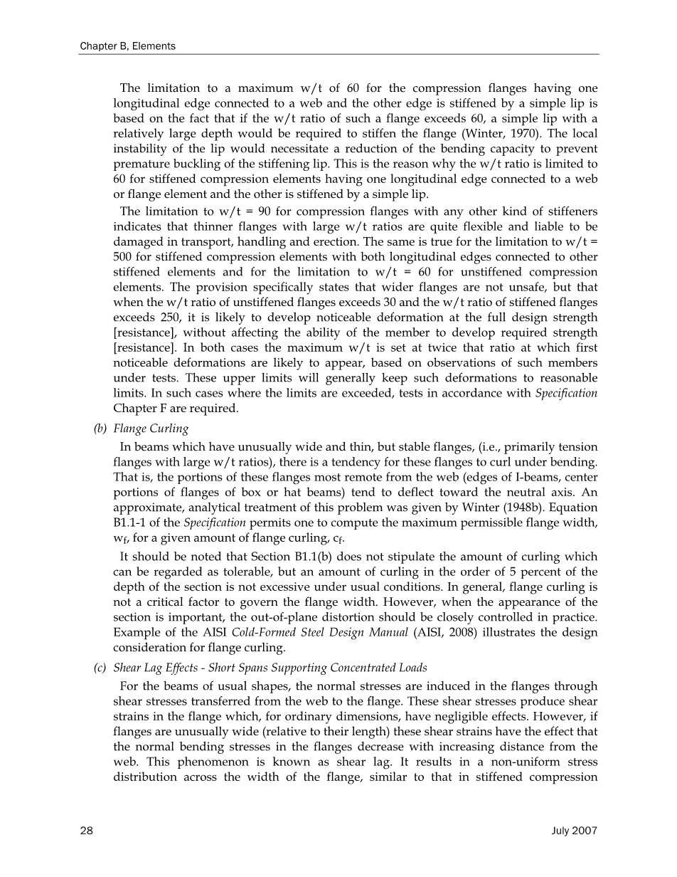 在具有异常宽且薄但稳定的翼缘的梁(即主要是具有较大w / t比的拉伸翼缘)的梁中,这些翼缘在弯曲下有卷曲的趋势。 也就是说,这些裂缝的最远离腹板的部分(I形梁的边缘,箱形或帽形梁的裂缝的中心部分)往往偏向中性轴线。 Winter(1948b)给出了这个问题的近似分析处理。 对于给定的法兰卷曲量cf,规范的等式B1.1-1允许计算最大允许法兰宽度wf。