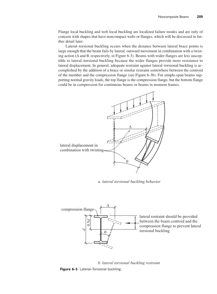 Lateral-torsional屈曲发生在横撑点之间的距离足够大,横向梁失败,向外运动结合扭转操作(Delta;andtheta;,分别在图6 - 3)。法兰较宽的梁不易受横向扭转屈曲的影响,因为法兰较宽的梁对横向位移的阻力较大。一般来说,通过在构件的质心和受压法兰之间添加支撑或类似的约束,就可以充分抑制横向扭转屈曲(见图6-3b)。对于支持正常重力载荷的单跨梁,上翼缘是受压凸缘,但底部法兰可以在瞬间框架内对连续梁或梁进行压缩。