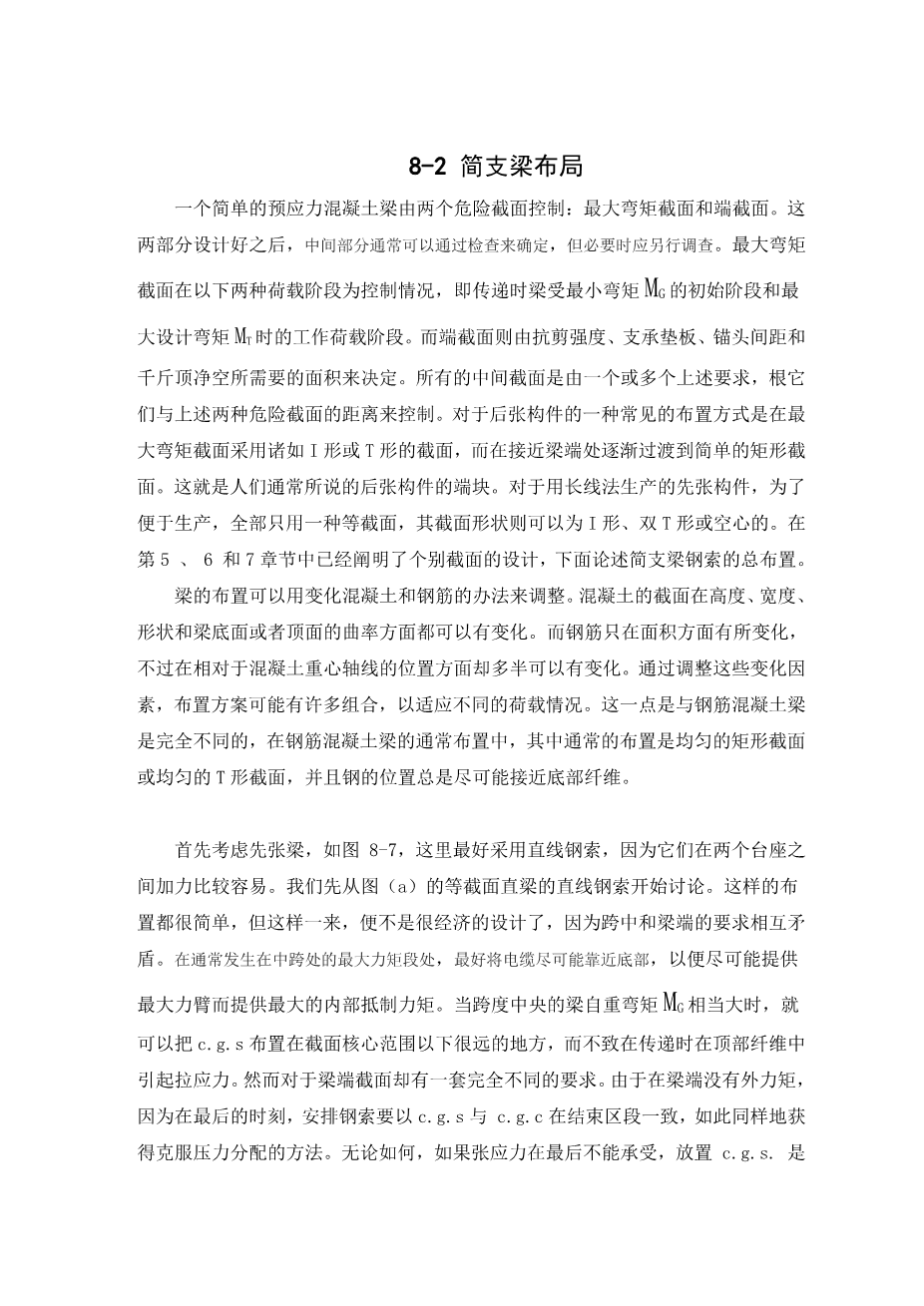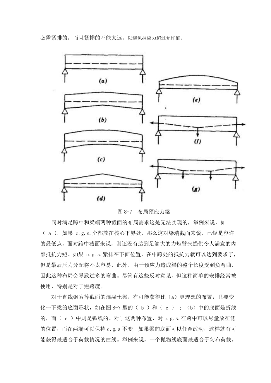 Consider first the pretensioned beams, Fig. 8-7.Here straight cables are preferred, since they can be more easily tensioned between two abutments. Let us start with a straight cable in a straight beam of uniform section, (a).This is simple as far as form and workmanship are concened, But such a section cannot often be economically designed, because of the conflicting requirements of the midspan and end sections. At the maximum moment section generally occurring at midspan, it is best to place the cable as near the bottom as possible in order to provide the maximum lever arm for the internal resisting moment. When the MG at midspan is appreciable, it is possible to place the c. g. s. much below the kern without producing tension in the top fibers at transfer. The end section, however, presents an entirely different set of requirements. Since there is no external moment at the end, it is best to arrange the tendons so that the c. g. s. will coincide with the c. g. c. at the end section, so as to obtain a uniform stress distribution. In any case, it is necessary to place the c. g. s. within the kern if tensile stresses are not permitted at the ends, and not too far outside the kern to avoid tension stress in excess of allowable values.