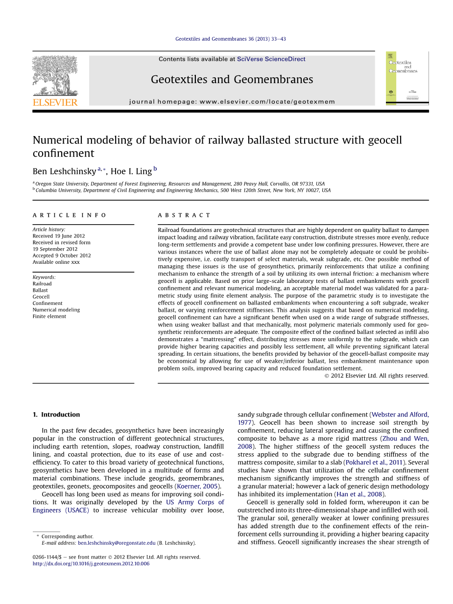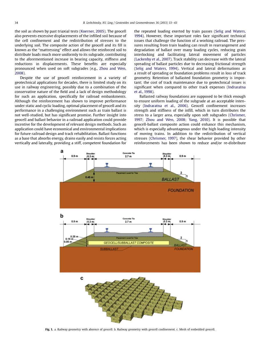 尽管几十年来土工格室加固在各种岩土工程中都得到了应用,但其在铁路工程中的应用的研究有限,可能是由于该领域的保守性质和这种应用的设计方法的缺乏,特别是对铁路路堤而言。虽然在静力和循环荷载作用下,土工格室加固已显示出改善性能,但在一个更具有具有挑战性的环境(如列车道砟)中,土工格室的优化布置及其性能没有得到很好的研究,这具有显著的前景。深入了解土工格室和道砟在铁路应用中的行为可以为促进相关设计方法的发展。这样的应用可能对未来的铁路设计和轨道恢复有经济和环境的影响。道砟的作用是吸收能量,容易排水并抵抗垂直和侧向作用的力,为火车通过的循环荷载提供一个坚固的、良好的基础(Selig and WATH,1994)。然而,这些重要的功能面临重大的技术问题,影响服役铁路的功能发挥。列车荷载所产生的压力会导致道砟在许多荷载循环后发生重排列和降解,减少颗粒联锁和引起颗粒的横向移动(Lackenby等人,2007)。随着摩擦强度的降低(Selig和WATE,1994),轨道稳定性随着道砟颗粒的横向扩展而减小。由于扩展或地基问题导致的竖向和侧向变形引起轨道几何损失。道砟基础几何形状的保持是很重要的,由于岩土问题,轨道维护成本与其他轨道费用相比更高昂的(Indraratna等,1998)。
