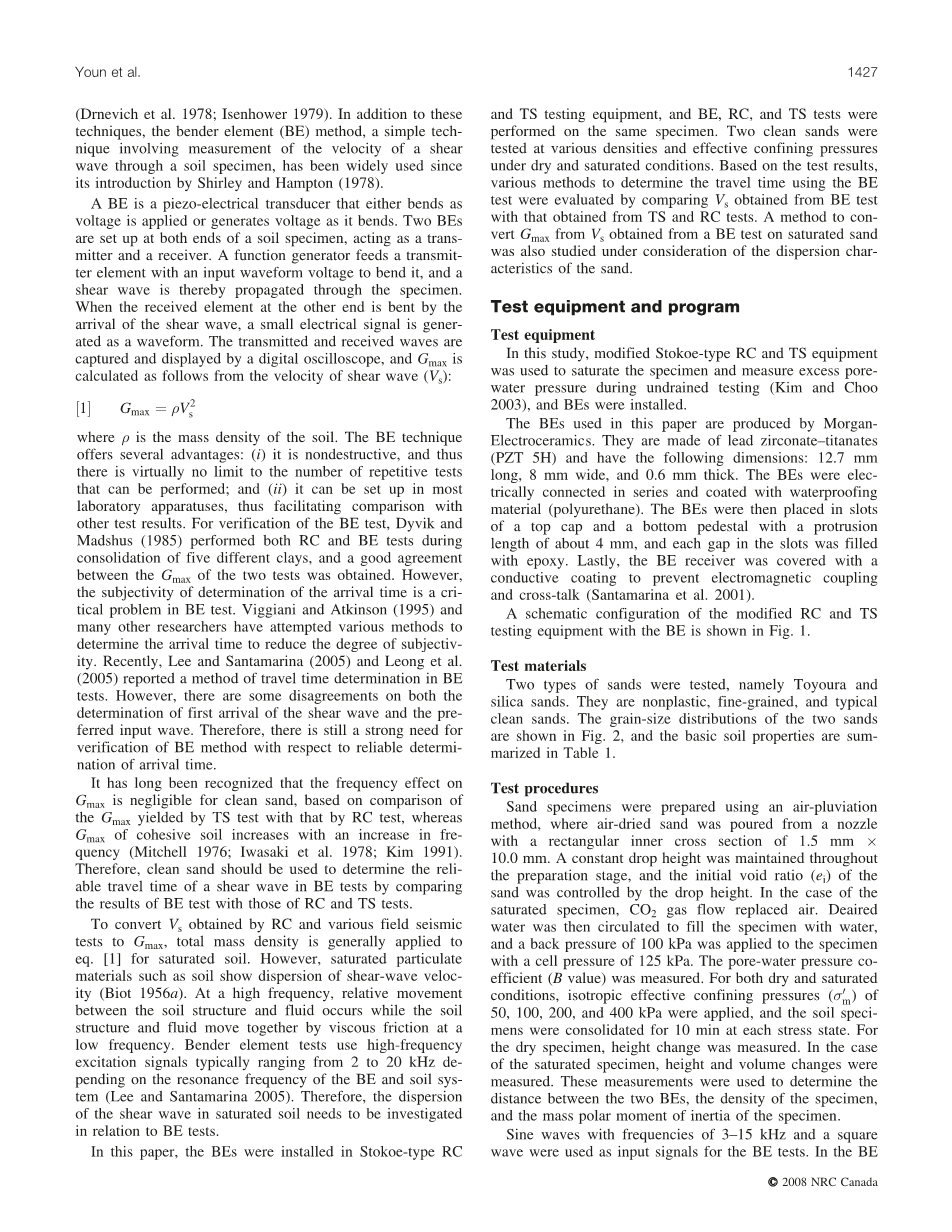 因此,通过将扭剪试验、共振柱试验和弯曲元试验的结果进行对比,可用纯净砂来获得可靠的弯曲元时间中剪切波的传播时间。为将共振柱试验以及各种现场地震试验获得的波速转化Gmax,通常在式【1】中饱和土应用总的质量密度。但是,如土的饱和粒状材料表现出剪切波速的离散性(Biot 1956a). 在高频时,土体结构和液体之间会产生相对位移,而在低频时,土体结构和液体会在粘滞摩擦下发生共同的位移。弯曲元试验使用高激发频率信号,根据弯曲元和土壤体系的整体的共振频率在2~20kHz的范围内具体选取(Lee and Santamarina 2005).因此,剪切波在饱和土体中的离散需要结合共振柱试验进行对比研究。