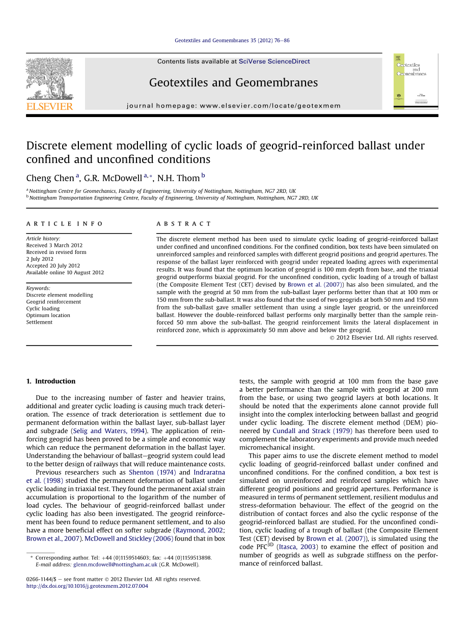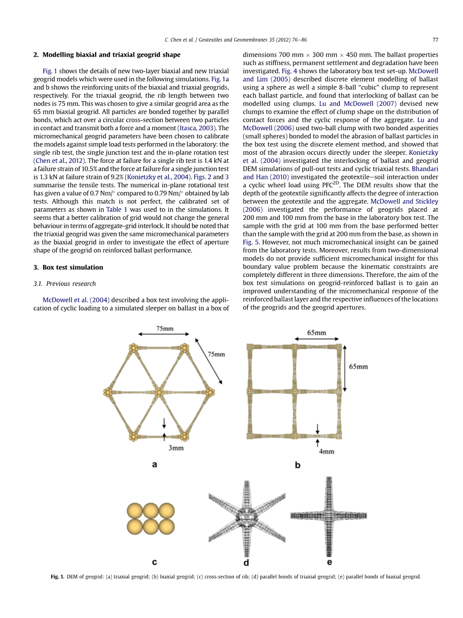 1、引言:由于更快和更重的火车越来越多,额外的更大的循环载荷逐渐导致轨道道道床恶化。轨道劣化的实质是道道床层和压载下层及路基永久变形引起的沉降。(Selig and Waters, 1994)实践证明,加筋土工格栅是降低道砟永久变形的一种简单、经济的方法。理解加筋土工格栅-道砟层系统的行为可能会对设计铁路有很好的帮助,从而降低维修成本。Shenton(1974)和Indraratna(1998)等人在三轴试验中研究了循环荷载作用下压载的永久变形。他们发现永久轴向应变积累与载荷循环次数的对数成正比。人们发现加筋土工格栅可以减少永久沉降,并且对软土地基也有更有利的影响(Raymond, 2002;Brown et al., 2007)。mcdowell和Stickley(2006)发现在箱子拉拔实验中中,距基底100mm处的土工格栅试样比距基底200mm处的土工格栅试样和在两个位置都使用两个土工格栅层的表现更好。需要指出的是,单靠实验并不能充分了解循环荷载作用下压载与土工格栅之间复杂的联锁现象。因此,由Cundall和Strack(1979)首创的离散单元法(DEM)被用来补充实验室实验,提供了很多需要的数据和微机械的见解。