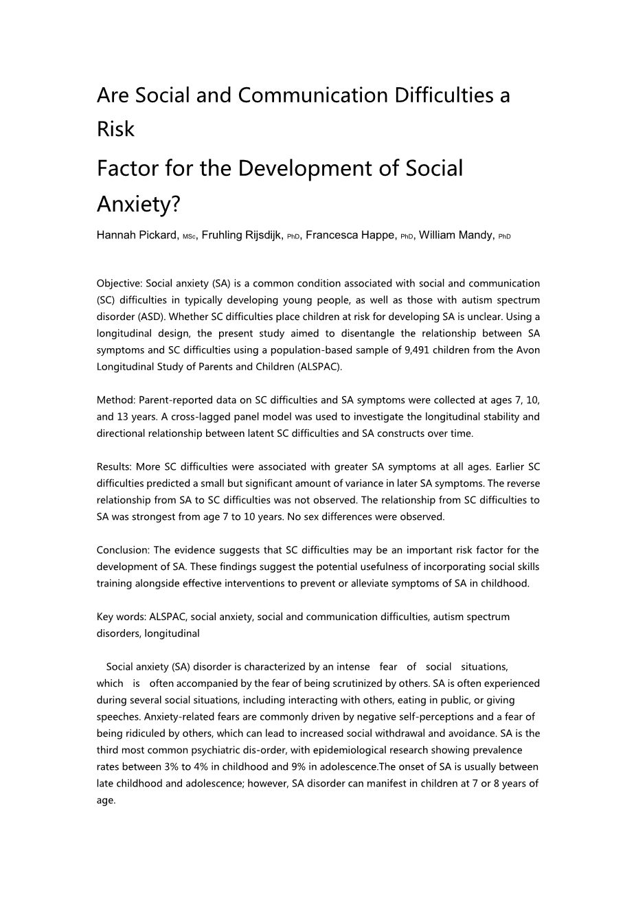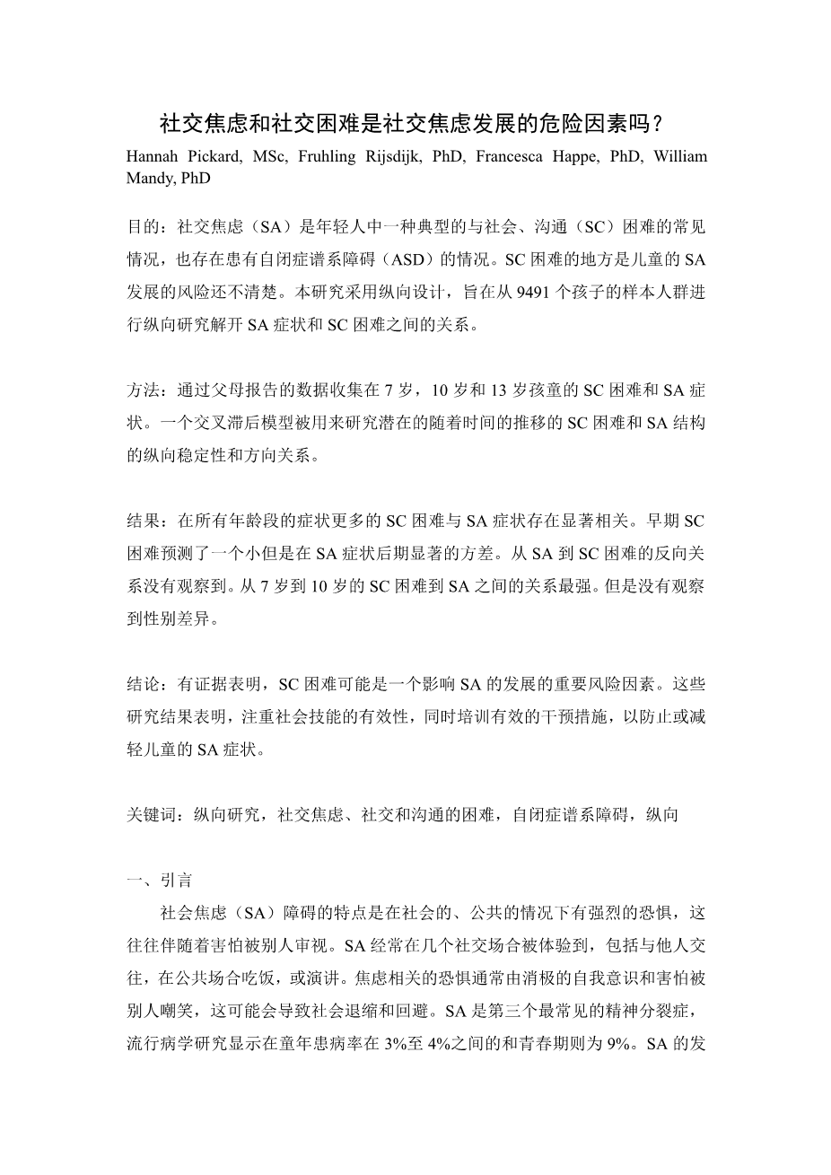 社交焦虑和社交困难是社交焦虑发展的危险因素吗?外文翻译资料 2022-08-12 14:27:24 英语原文共 11 页,剩余内容已隐藏,支付完成后下载完整资料 英语译文共 11 页,剩余内容已隐藏,支付完成后下载完整资料 资料编号:[486798],资料为PDF文档或Word文档,PDF文档可免费转换为Word 原文和译文剩余内容已隐藏,您需要先支付 30元 才能查看原文和译文全部内容!立即支付 发小红书推广免费获取该资料资格。点击链接进入获取推广文案即可: Ai一键组稿 | 降AI率 | 降重复率 | 论文一键排版 PREVIOUS NEXT 您可能感兴趣的文章 音乐启发训练分析外文翻译资料 古筝史外文翻译资料 从序列看五声性——中国当代音乐中不同传统的整合外文翻译资料 浅析新疆歌曲《曲蔓地》的演唱风格及技巧分析外文翻译资料 从戏曲到谭盾的中国戏曲打击乐外文翻译资料 我们时代的音乐教学:学生音乐教师对音乐教育、教师教育和成为教师的思考外文翻译资料 我们时代的音乐教学:学生音乐教师对音乐教育、教师教育和成为教师的思考外文翻译资料 莫扎特的降E大调小提琴协奏曲外文翻译资料 文化视域下古筝艺术表演技法的传承与创新研究外文翻译资料 文化视角下古筝表演艺术的传承与创新研究外文翻译资料
