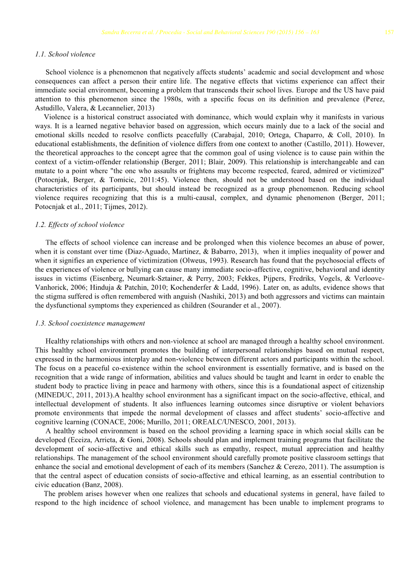 健康的学校环境对学生的社会情感,道德和智力发展产生了重大影响。它也影响学习成果,因为破坏性或暴力行为促进阻碍课堂正常发展的环境,并影响学生的社会情感和认知学习(CONACE,2006; Murillo,2011; OREALC / UNESCO,2001,2013)。一个健康的学校环境是建立在学校提供社会技能发展学习空间的基础之上的(Eceiza,Arrieta,&Goni,2008)。学校应规划和实施促进社会情感和道德技能发展的培训计划,如同情,尊重,相互欣赏和健康关系。