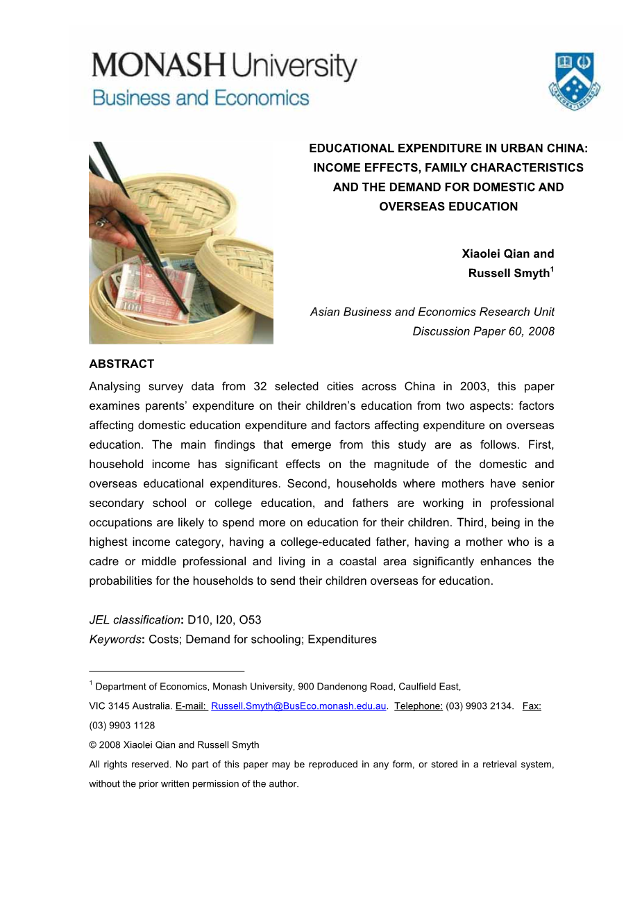 从入选的32个城市在中国的调查数据分析,收集于2003,本文考察了影响父母子女家庭教育支出的因素。与其他家庭消费支出不同的是,教育支出通常被视为家庭当前消费的先决条件,为下一代的未来利益。因此,花多少钱和如何使用它取决于家庭的预算约束和其对代际转移的偏好。本研究探讨的教育需求在中国的城市家庭对教育的支出审查模式的影响因素,从而揭示了中国所面临的父母在为他们的孩子提供教育机会的选择。