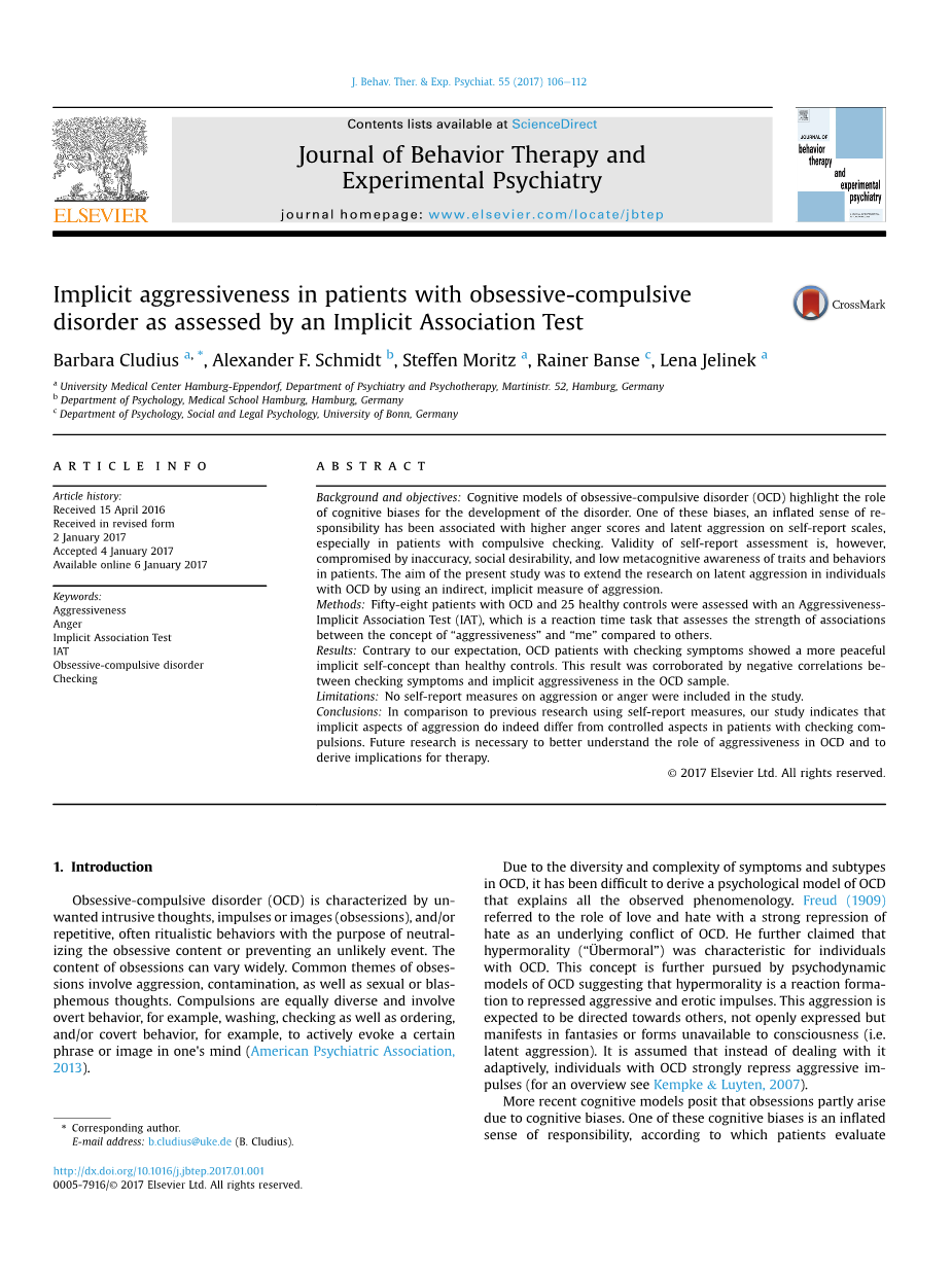 在开发的各种内隐措施中,内隐关联检验(IAT; Greenwald,McGhee,Schwartz,1998)与其他内隐范式(Bar-Anan&Nosek,2014)相比,显示出更好的心理测量特性。 IAT以前被雇用来评估侵略行为与自我之间的隐含联系(Banse等人。,2015; Grumm,Hein,&Fingerle,2011; Richetin等,2010; Schmidt等,2015)。已经显示出可以预测明显的和可观察的侵略行为(Banse等,2015),对参与者(Richetin 等人。,2010)激发的实验者(即侵略行为的机会)的负面评价以及受阻自治者的反应性侵略,监管资源(Schmidt 等人。,2015)。本研究的目的是通过使用间接隐含的侵略措施,进一步揭示OCD(潜在)侵略的动态。为此,用OCD和健康对照的患者用修改版本进行了测试