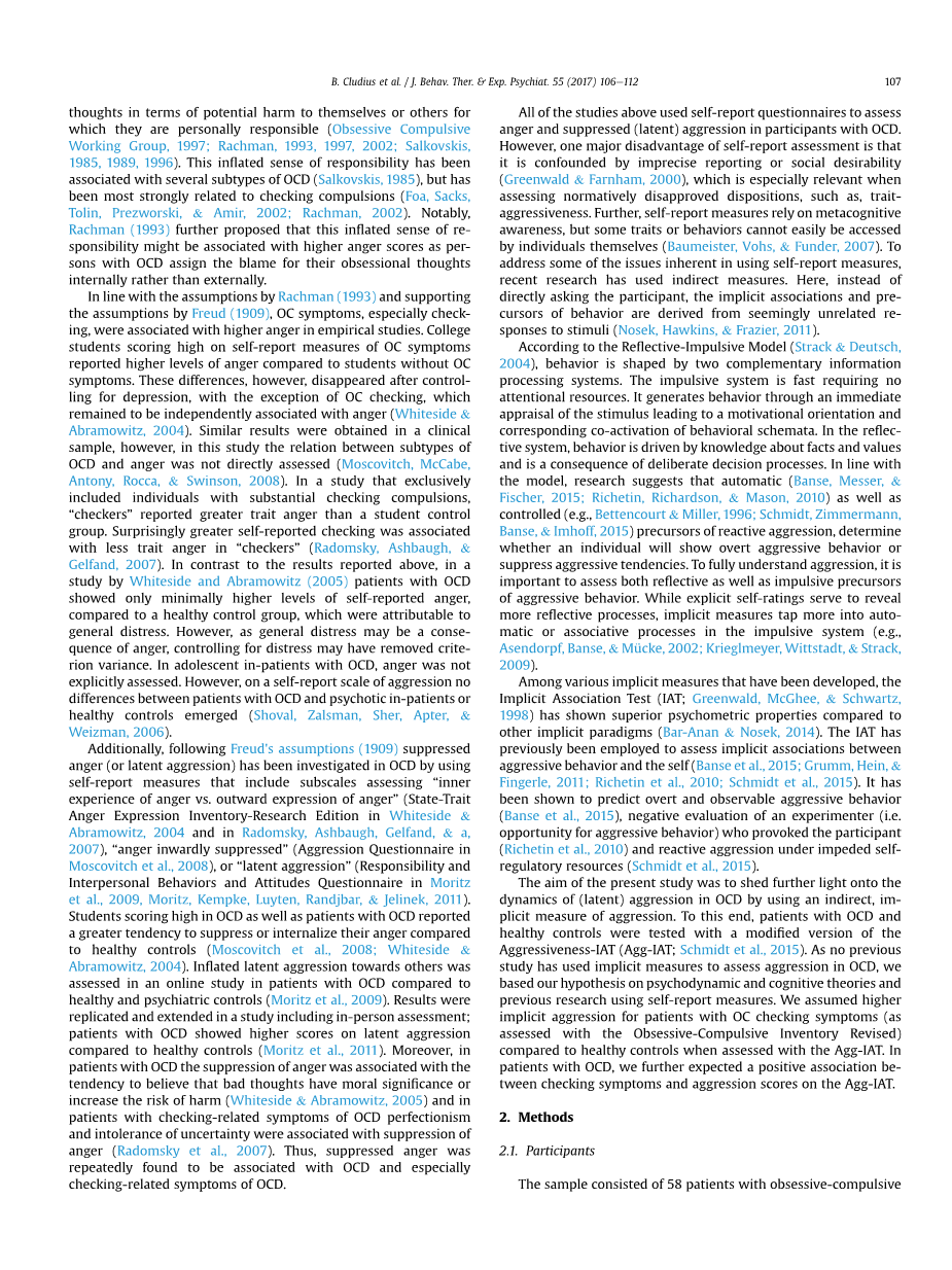 侵略性IAT(Agg-IAT; Schmidt 等人。,2015)。不可比拟的研究使用内隐措施来评估OCD中的侵略行为,我们基于假设动力学和认知过程以及以前使用自我报告措施的研究。对OC检查症状的患者进行了较高的内隐侵略(与强制性强制性库存进行评估评估)与使用Agg-IAT评估的健康对照相比较。 在OCD患者中,我们进一步预测了Agg-IAT检查症状和侵袭评分之间的积极关联。
