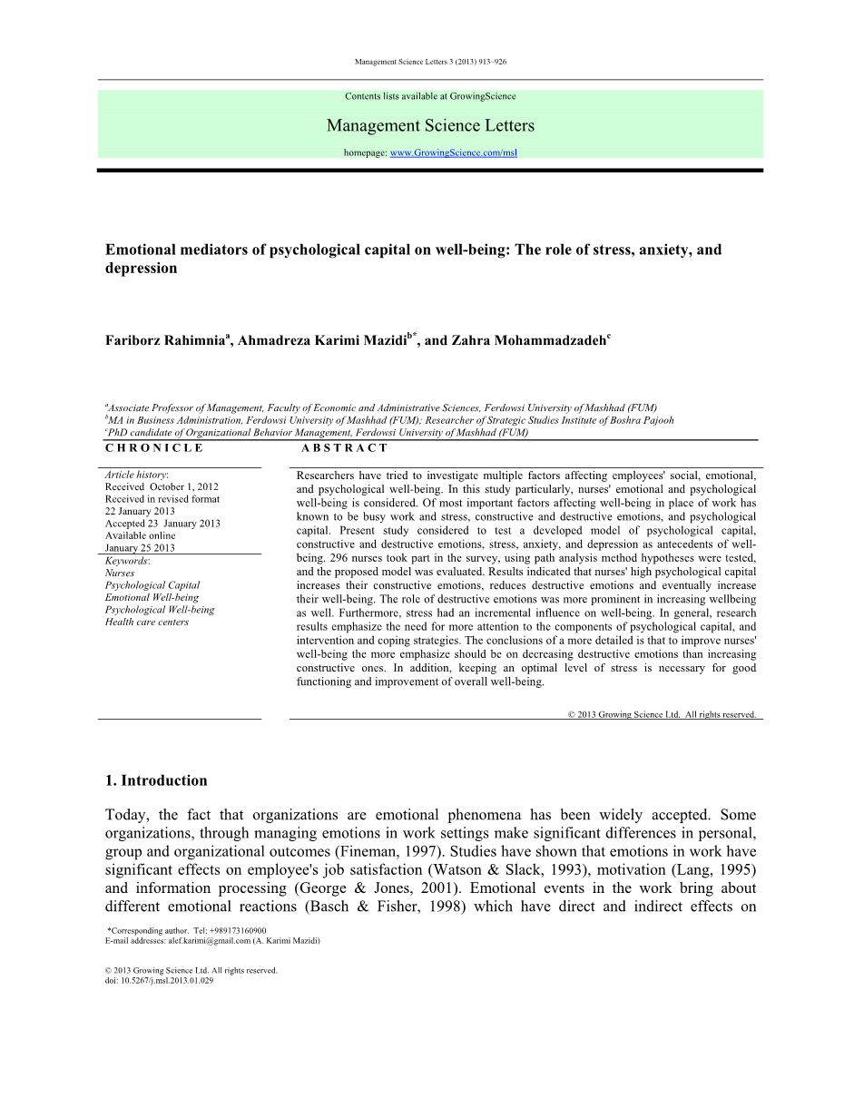 摘要:研究人员试图调查影响员工社会,情绪和心理健康的多重因素。在这项研究中,特别考虑了护士的情绪和心理健康。影响幸福感最重要的因素包括工作繁琐、压力大、建设性与破坏性的情绪以及心理资本。目前的研究被认为是测试心理资本,建设性和破坏性情绪,压力,焦虑和抑郁症的发展模式,作为幸福的前提。296名护士参加了调查,使用路径分析法对假设进行了测试,并对该模型进行了评估。结果表明,护士的高心理资本增加了建设性情绪,减少了破坏性情绪,最终增加了幸福感。破坏性情绪对增加幸福感有很大的作用。此外,压力对幸福感也有正面的影响。一般来说,研究结果需要更多地关注心理资本的组成部分,干预和应对策略。更详细的结论是:为了提高护士的幸福感,减少破坏性情绪越来越被强调,而不是强调增加建设性的情绪。此外,在良好的功能和整体方面,健康的改善和保持最佳的压力水平是十分必要的。