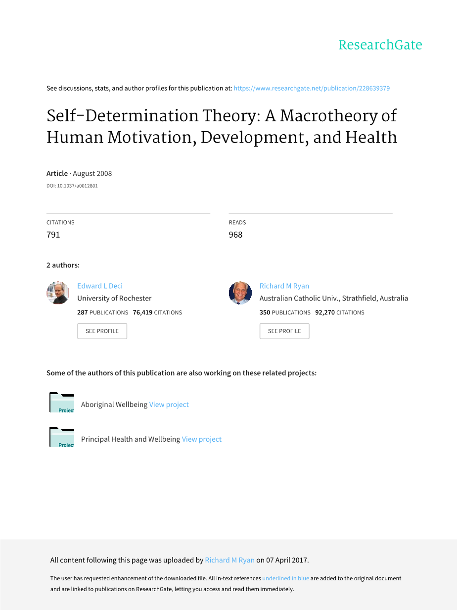 自我决定理论(SDT)是一种基于经验的人类动机,发展和健康的理论。该理论侧重于动机的类型而不仅仅是数量,特别关注作为个体表现、相关幸福结果预测因素的自主动机,受控动机和无动机。它还解决了提高或降低这些类型的动机的社会条件,提出并发现自主性,能力和相关性的基本心理需求的角度,和相关支持与反对动机类型和强度的影响。SDT也检查人们的生活目标或愿望,显示内在和外在的生活目标、表现与心理健康的差异性关系。我们也在这个介绍简要讨论最近的事态发展在SDT念力和活力,并突出显示适用性SDT的应用领域,包括工作、关系、养育、教育、虚拟环境、运动、可持续性、卫生保健和心理治疗。