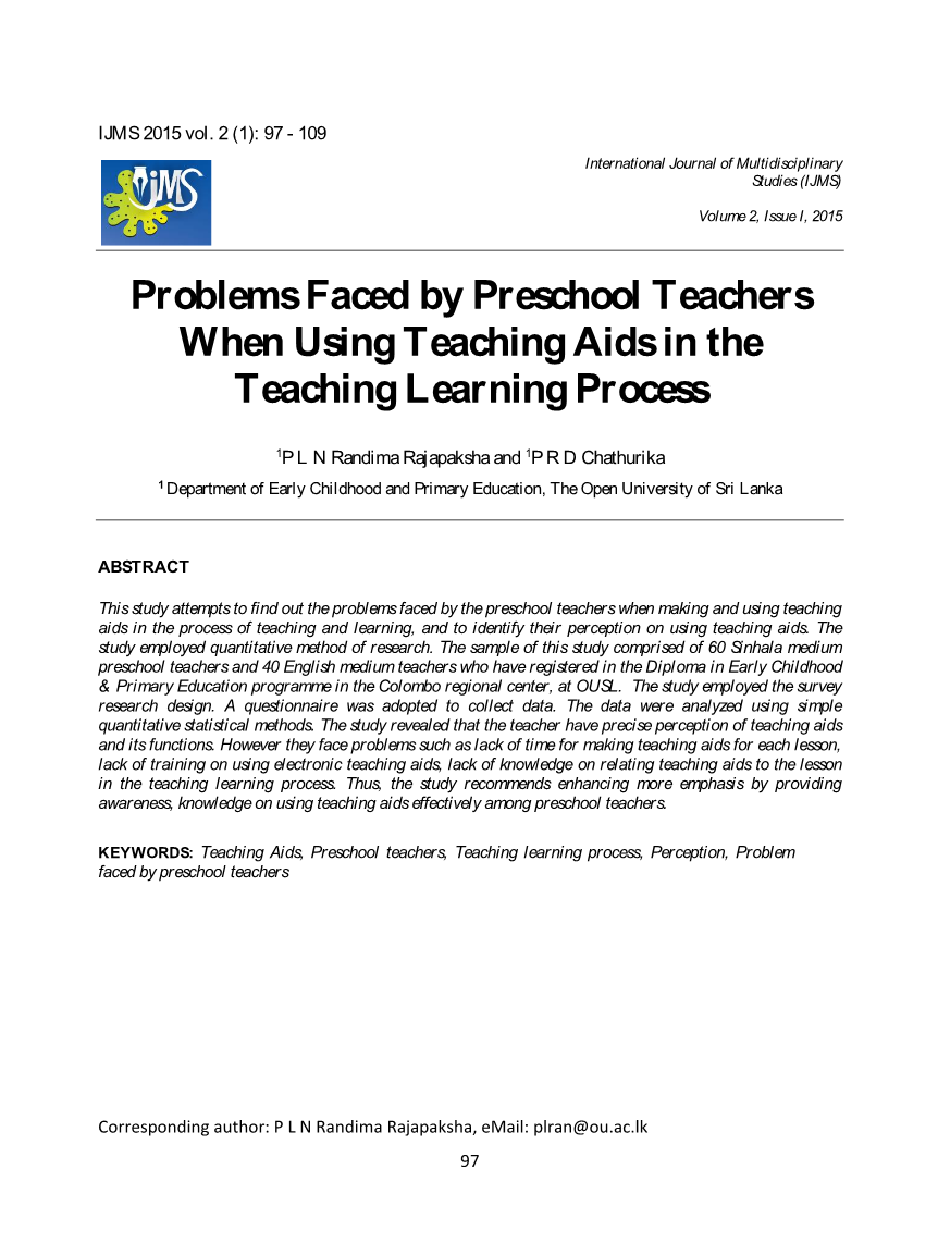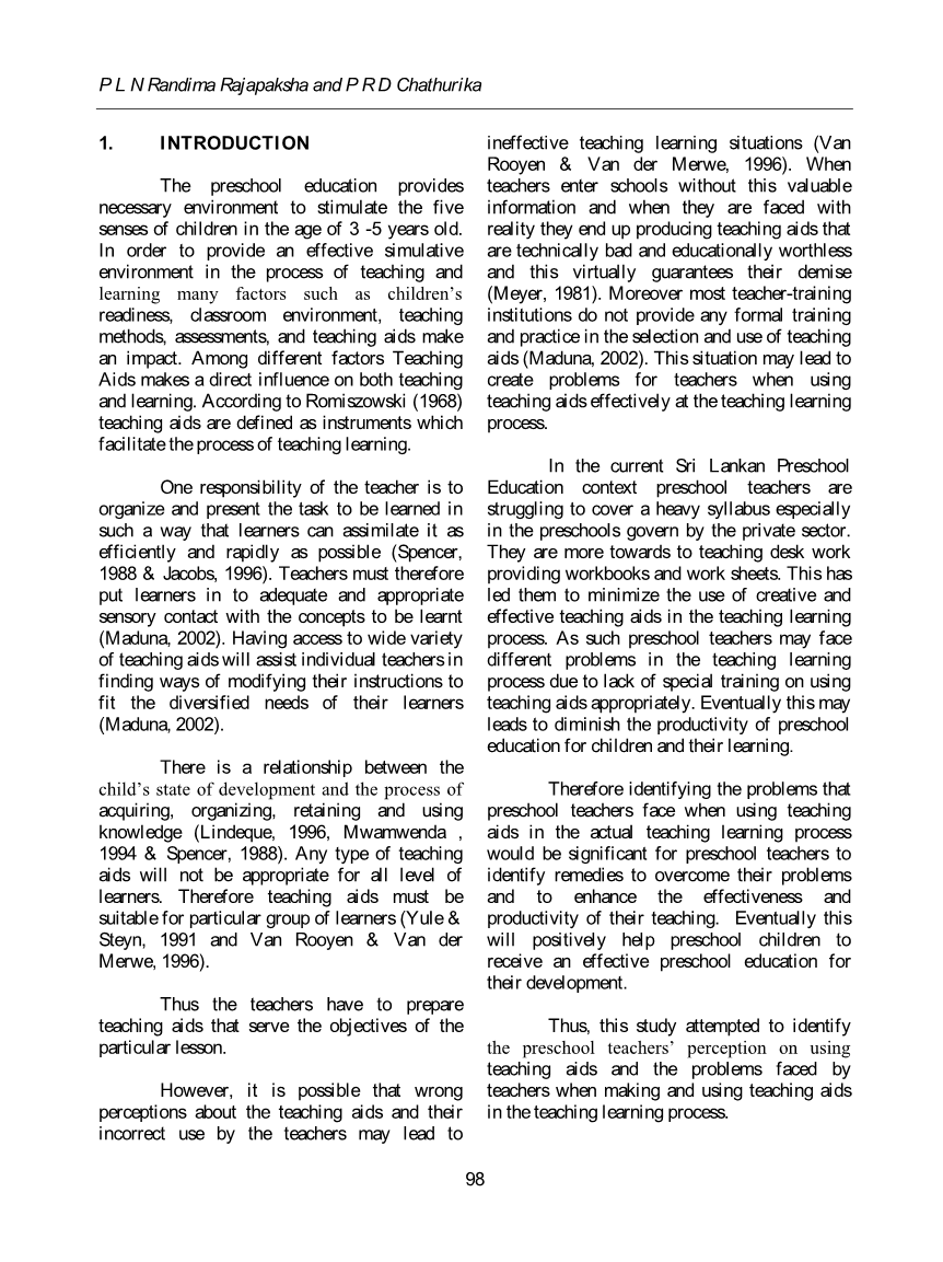 由于我们都遵循传统的方法,并且通过使用不同的演习来记住教学过程当中的概念,但是现在我们可以改变方式,使用与课程相符合的教具,如投影机,模型和实验道具去记住这些概念,这个概念将被清楚地理解。然而,有可能是教师对教具的错误观念及其不正确的使用导致教学学习的情况无效(范·罗恩&,范德梅韦1996)。没有这些正确的观念的老师进入学校时,当他们面对现实时,他们会制作出技术上、教育上完全没有意义的教具,这最终会导致他们在现实生活中让位和退步(迈耶,1981)。此外,大多数培训机构在选择和使用教具方面没有为幼儿教师提供正式的培训和实践机会(马达纳,2002年)。这种情况可能会导致教师在教学过程中有效地使用教学辅助工具时产生许多问题。