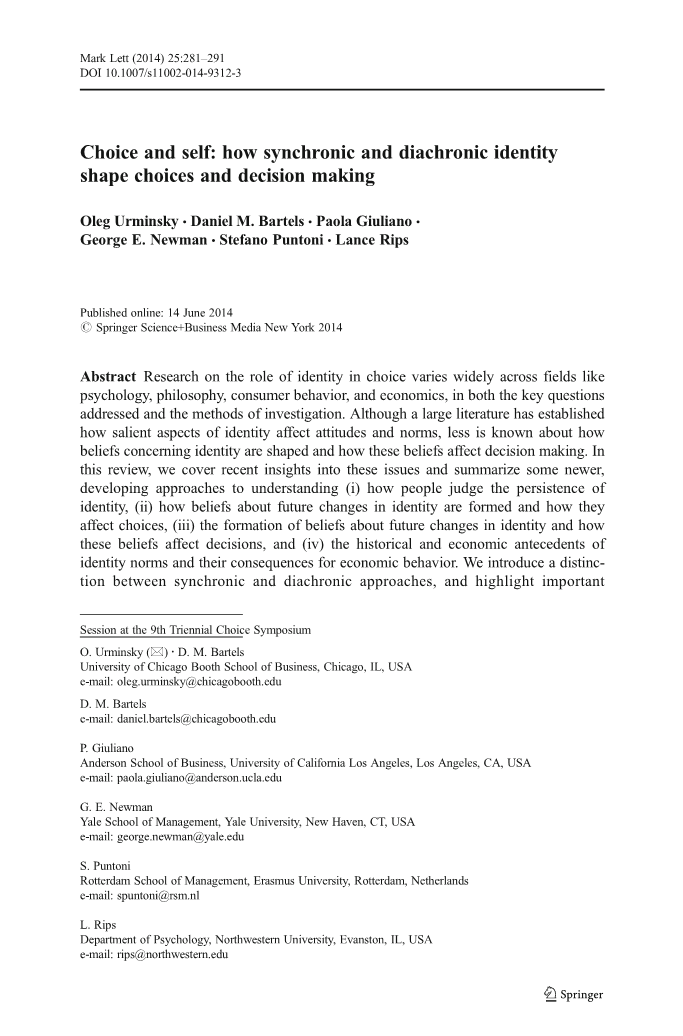 Oleg Urminsky amp; Daniel M. Bartels amp; Paola Giuliano amp;George E. Newman amp; Stefano Puntoni amp; Lance Rips