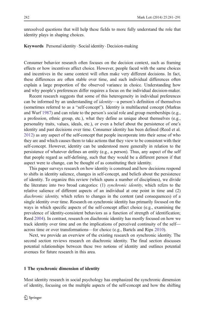 本文调查了关于身份如何解释以及决策如何回应的研究改变身份显着性,改变自我概念,以及关于持久性的信念的身份。为了组织这个审查(跨越一些学科),我们分裂文献分为两大类:(1)同步身份,即指在一个时间点个人不同方面的相对显着性,(2)历时身份,其指的是内容(和后果)的变化单身身份随着时间的流逝。同步身份研究主要集中在自我概念的具体方面影响选择的方式(例如,检查作为识别强度的函数的身份一致行为的流行;Reed 2004)。相比之下,历时认同的研究主要集中在我们如何跟踪身份随着时间的推移,以及对自我认知的连续性的影响,跨越时间或过渡的变化 - 选择(例如,Bartels和Rips 2010)。