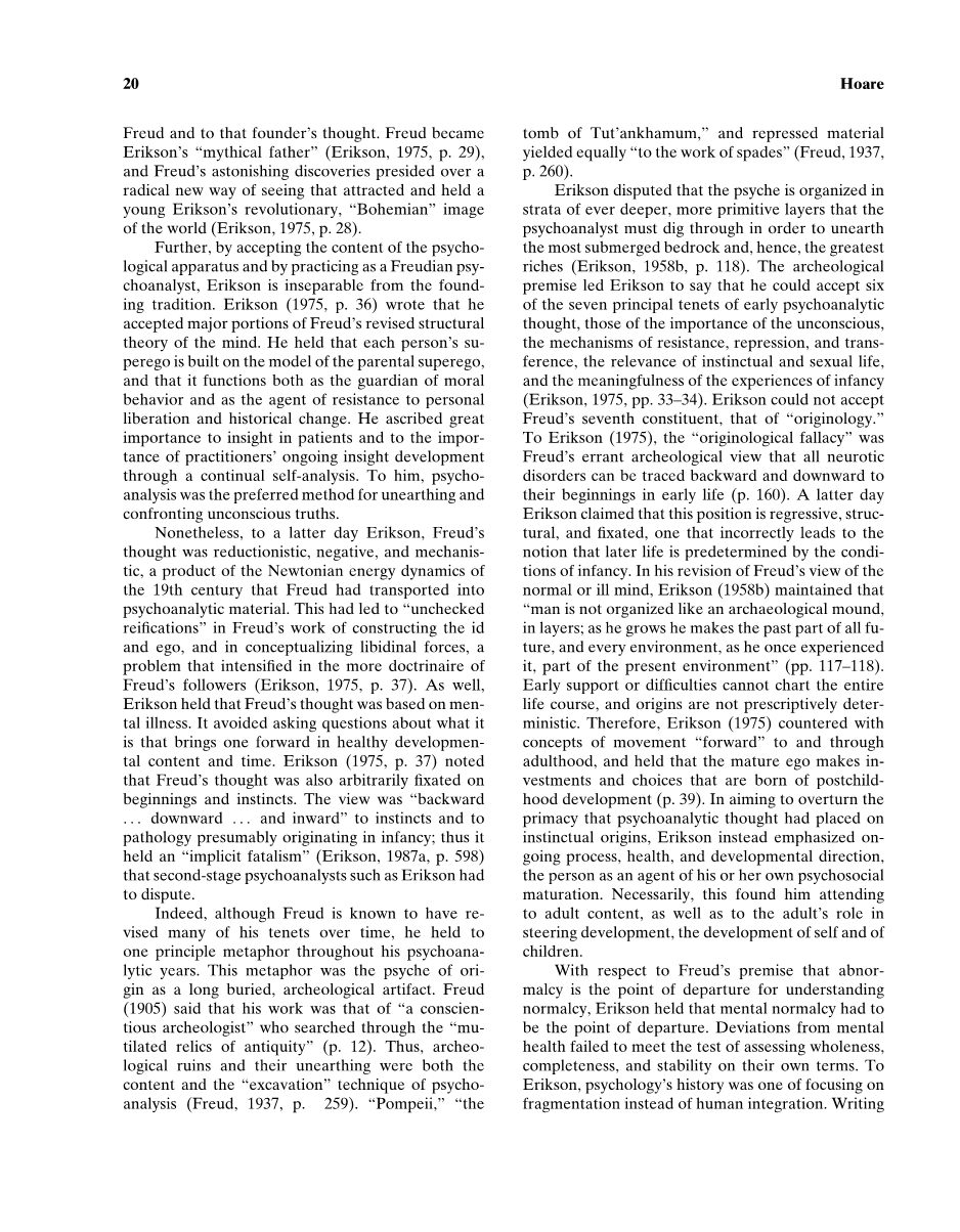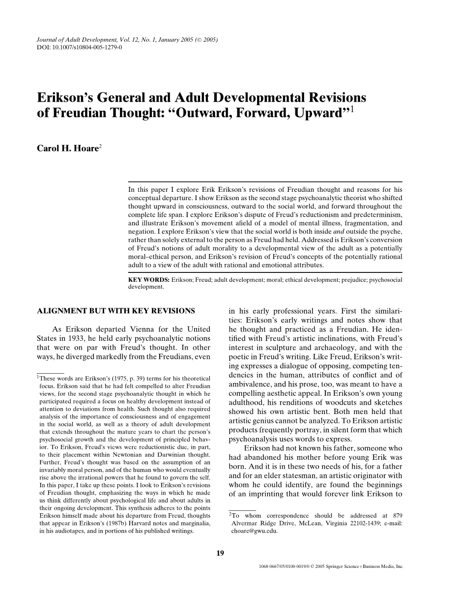 在本文中,我探讨了埃里克·埃里克森对弗洛伊德思想的调整和他的概念出发的原因。我将埃里克森视为第二阶段精神分析理论家,将思想向上转移到社会世界,并在整个生命周期中前进。我探索埃里克森的弗洛伊德的还原主义和预定论的争论,并且说明了埃里克森的精神病、分裂和否认模式的运动。我探索了埃里克森认为社会世界是在心灵内部和外部,而不是弗洛伊德所拥有的人的外在之处的观点。埃里克森将弗洛伊德的成人道德概念转化为成年人的发展观,作为一个潜在的道德伦理的人,埃里克森以成人的理性和情感属性的观点修改了弗洛伊德的潜在理性成年人的概念。