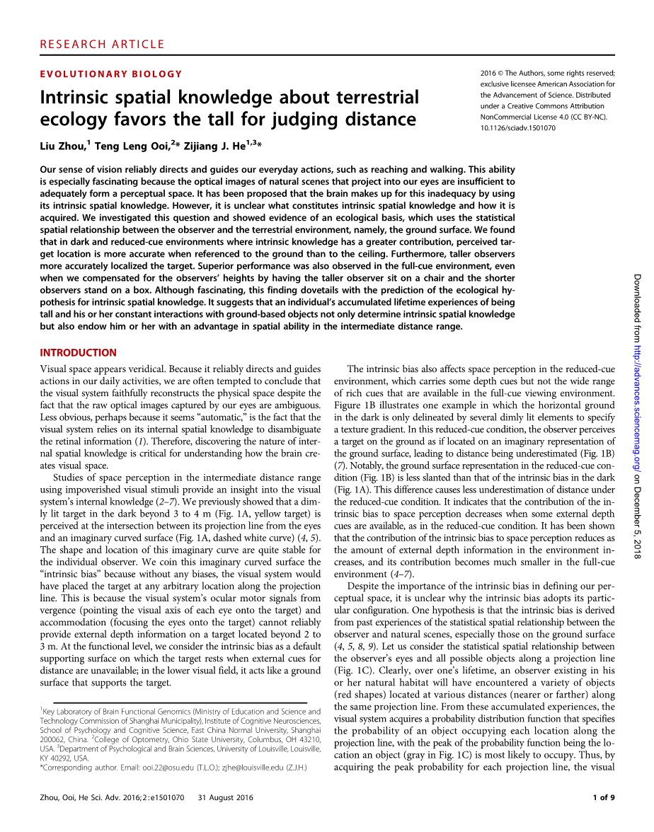 视觉可靠地直接指导日常生活中的行为,例如伸手、走路。这种能力特别令人着迷,因为投射到我们眼睛里的自然景物的光学图像不足以使人形成感知空间。有人提出,大脑利用其固有的空间知识来弥补这一不足。然而,还不清楚是内在的空间知识包括哪些以及如何获得这些知识。我们调查了这个问题,并给出了一个生态基础的证据,利用观测者与地面环境 the terrestrial environment即地面ground surface之间的统计空间关系。我们发现在黑暗和缺乏线索的环境中,固有知识有更大的贡献,相较于参照天花板的信息,当观察者参照地面信息时,目标位置知觉更准确。此外,身高更高的观察者更准确地定位目标。在全线索环境下,即使我们让个子较高的观察者坐在椅子上,个子较矮的观察者站在箱子上,以补偿观察者的身高,也能观察到高个子在目标定位上更出色的表现。这一发现虽然引人入胜,但却与内在空间知识的生态学假说的预测相吻合。这说明个体一生中所积累的身高经验和不断与地面物体的相互作用不仅决定了其内在的空间知识,而且使其在中距离空间能力上具有优势。