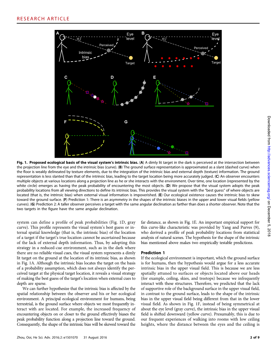 我们可以进一步假设,观察者与生态环境之间的空间关系会影响其固有偏差。作为陆地生物,人类的一个主要生态环境是我们最经常与之互动的物体所在的地表。例如,在地面上或靠近地面的地方遇到物体的频率增加,就是使峰值概率朝地面倾斜。因此,如图1E所示,固有偏差的形状将向远处倾斜。Yang和Purves(9)为这种曲线状特征提供了重要的经验支持,他们从自然场景的统计分析中得出了峰值概率位置的分布情况。上述假设作出了两个经验性可检验的预测。