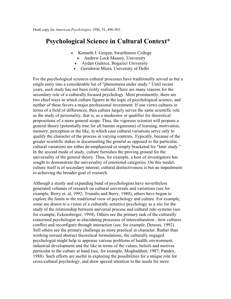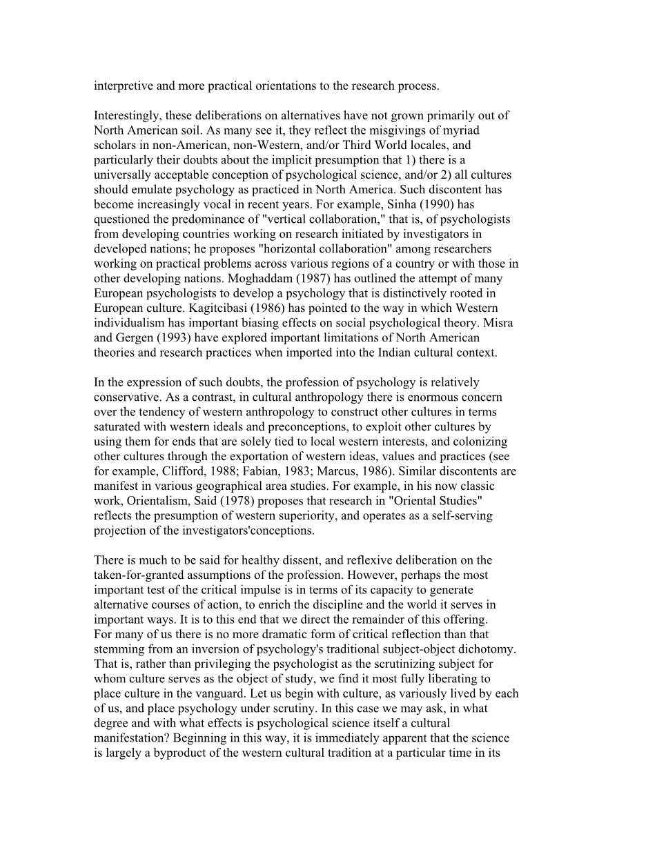 在这种疑虑的表达上,心理学这个职业是比较保守的。作为对比,在文化人类学中有巨大的担忧西方人类学的倾向构建其他文化饱和与西方的理想和偏见,利用其他文化通过使用他们的结束仅仅与当地西方利益,通过出口和其他殖民文化的西方思想,价值观和实践(例如,克利福德,1988;费边,1983;马卡斯,1986)。类似的不满在各种地理区域研究中都表现得很明显。例如,赛义德(1978)在他现在的经典著作《东方主义》中提出,“东方研究”的研究反映了西方优越性的假设,并作为研究人员概念的一种自我服务的投射。对于健康的异议,以及对这个行业想当然的假设的反思,有很多值得讨论的地方。然而,也许对批判冲动最重要的检验是它是否有能力产生可供选择的行动方针,以丰富学科及其重要服务的世界。我们为这目的引导其余的供应品。对我们许多人来说,没有什么比心理学传统的主客体二分法的倒转所产生的批判性反思更具有戏剧性的形式了。换句话说,我们不把心理学家作为研究对象,而把文化作为审视对象,而是把文化作为最充分的解放。让我们从文化开始,因为我们每个人都有不同的生活方式,并把心理学置于审视之下。在这种情况下,我们可能会问,心理科学本身在多大程度上是一种文化表现?这样一来,很明显,科学在其历史发展的特定时期,很大程度上是西方文化传统的副产品。例如,关于知识的本质、客观性的特征、知识产生过程中的价值地位以及语言表征的本质的假设,都带有一种独特的文化传统的印记。最有趣的是,心理科学的特征是由关于人类心理学本身的先天假设所决定的(Gergen, 1994)。也就是说,科学是建立在某些关于科学家个体心理功能的假设之上的;没有这些假设,我们所知道的科学就无法理解。例如,人们假定科学家具有一种有意识的或观察的头脑,能够反映和记录外部世界的性质;科学家拥有归纳和演绎逻辑的能力;科学家还怀有动机和价值观,如果没有保障,这些动机和价值观就会模糊观察,干扰逻辑过程。所有这些基础假设都是西方民族心理学的组成部分(参见Heelas和Lock, 1981)。在下文中,我们希望更充分地表达具体的文化立场。从不同的文化背景和不同的历史文化敏感的研究,我们探讨了一系列的问题所引发的假设普遍的心理学。然而,我们也开始探索文化至上对心理学的好处,而不是停留在批判中。