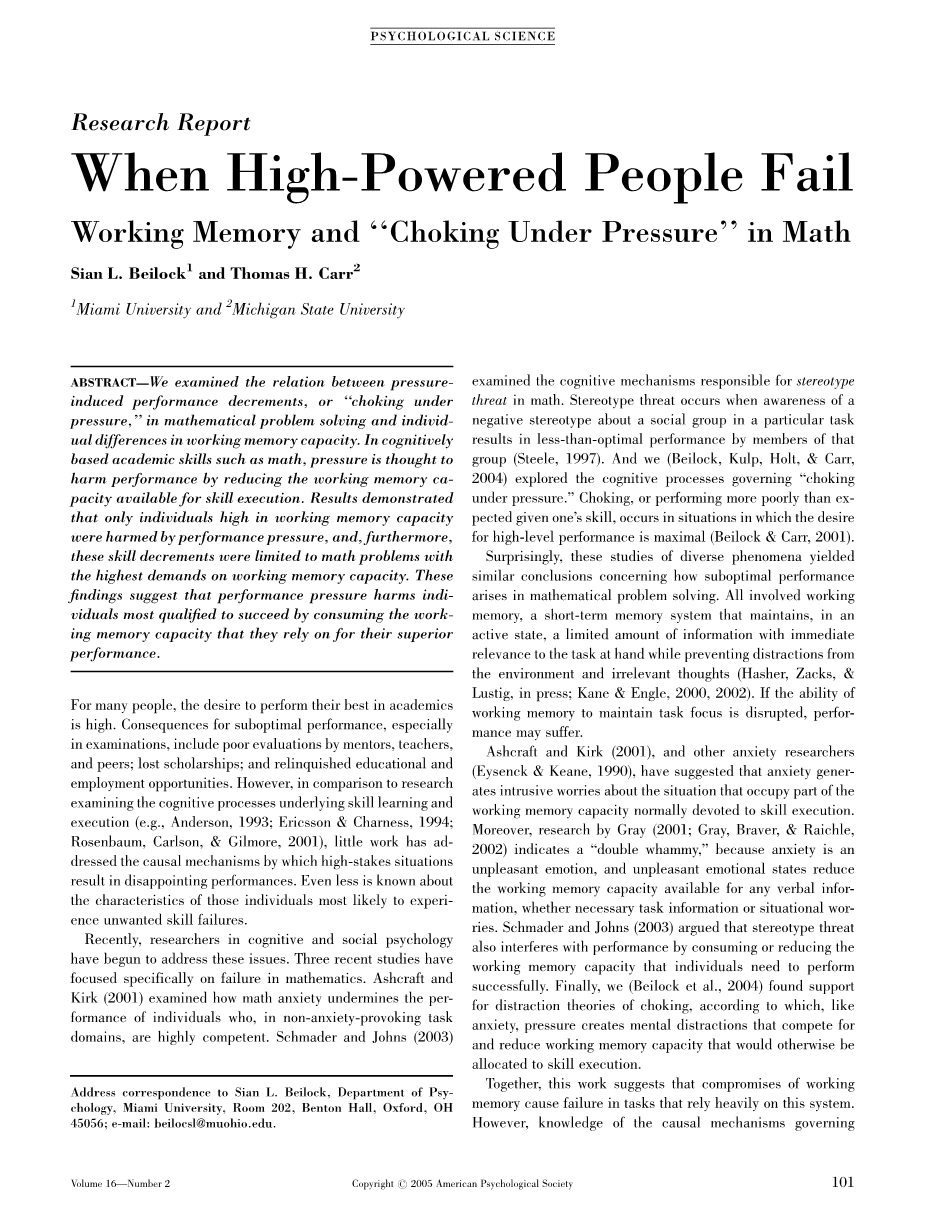 最近,认知和社会心理学的研究人员已经开始解决这些问题。最近的三项研究特别关注数学中的失败。Ashcraft和Kirk (2001)研究了数学焦虑是如何破坏那些在不引起焦虑的任务领域中非常有能力的人的表现的。Schmader和Johns(2003)研究了数学中造成刻板印象威胁的认知机制。刻板印象威胁发生在当意识到在特定任务中对某个社会群体的负面刻板印象导致该群体成员的表现不佳时(Steel,1997)。我们((Beilock, Kulp, Holt, amp; Carr,2004)探索了控制“压力下choking”的认知过程。choking,或表现比预期的更差,发生在对高水平表现的渴望最大的情况下((Beilock amp; Carr,2001)。