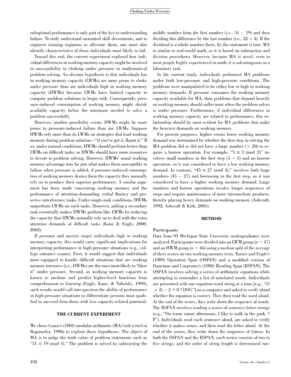 在目前的研究中,个体在低压和高压条件下都进行模运算任务,这些问题被操纵成工作记忆需求低或高。如果压力消耗了模运算任务可用的工作记忆容量,那么当问题解决者处于压力之下时,严重依赖工作记忆的问题将受到最大的影响。此外,如果工作记忆容量的个体差异与表现有关,这种关系对于对工作记忆要求最大的模运算问题应该是最明显的。