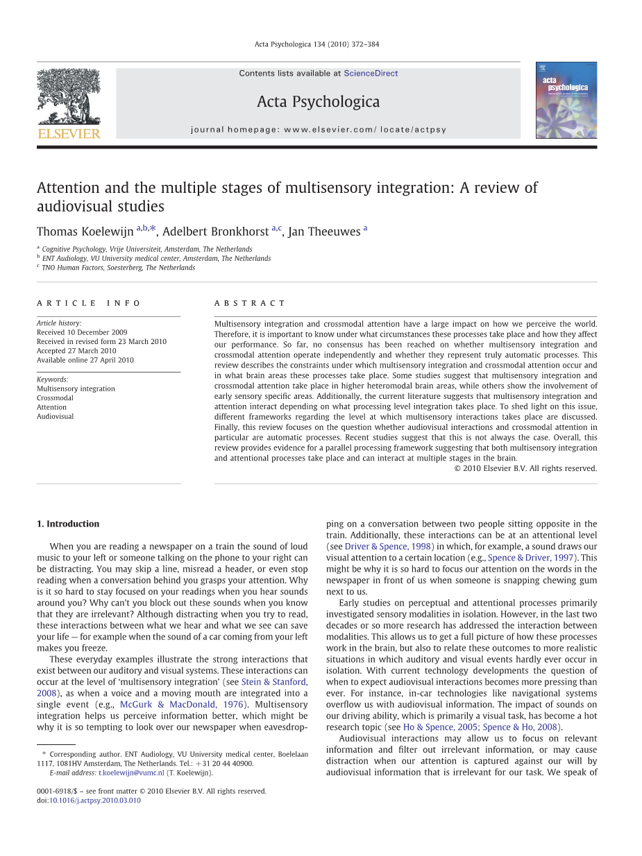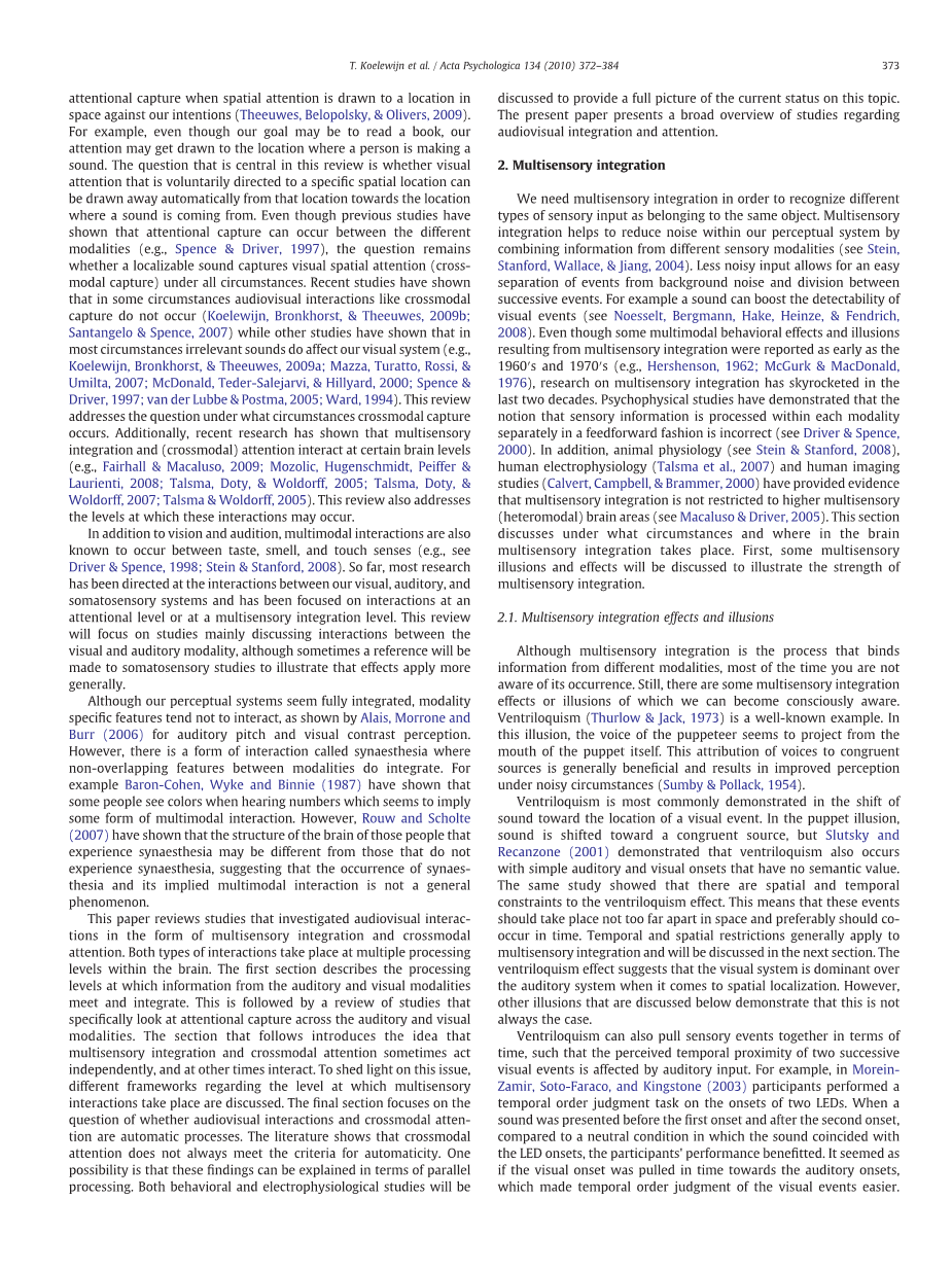 视听交互可以使我们专注于相关信息并过滤掉不相关的信息,或者当与我们的任务无关的视听信息违反我们的意愿吸引我们的注意力时,可能会引起分心。我们谈到当违反我们的意图将注意力吸引到空间中的某个位置时,注意力捕获(Theeuwes,Belopolskyamp;Olivers,2009)。例如,即使我们的目标可能是看书,但我们的注意力可能会吸引到一个人发出声音的位置。在这篇评论中最重要的问题是,是否可以将自动定向到特定空间位置的视觉注意力从该位置自动吸引到声音来自的位置。即使以前的研究表明,注意力吸引可以在不同的方式之间发生(例如Driveramp;Spence,1997),问题仍然在于,可本地化的声音是否在所有情况下都能捕获视觉空间注意力(交叉模式捕获)。最近的研究表明,在某些情况下不会发生视听交互,例如跨模式捕获(Koelewijn,Bronkhorstamp;Theeuwes,2009;Santangelo&Spence,2007),而其他研究表明,在大多数情况下,不相关的声音确实会影响我们的视觉系统(例如Koelewijn,Bronkhorstamp;Theeuwes,2009; Mazza,Turatto,Rossiamp;Umilta,2007;McDonald,Teder-Salejarviamp;Hillyard,2000;Driveramp;Spence,1997;vanderLubbeamp;Postma,Ward,2005;1994)。这篇综述解决了在什么情况下发生交叉峰捕获的问题。此外,最近的研究表明,多感官整合和(交叉模式)注意力在某些大脑水平(例如,Fairhallamp;Macaluso,2009; Mozolic,Hugenschmidt,Peifferamp;Laurienti,2008; Talsma,Dotyamp;Woldorff,2005; Talsma,Dotyamp;Woldorff,2007; Talsmaamp;Woldorff,2005)。这篇评论还探讨了这些相互作用可能发生的水平。