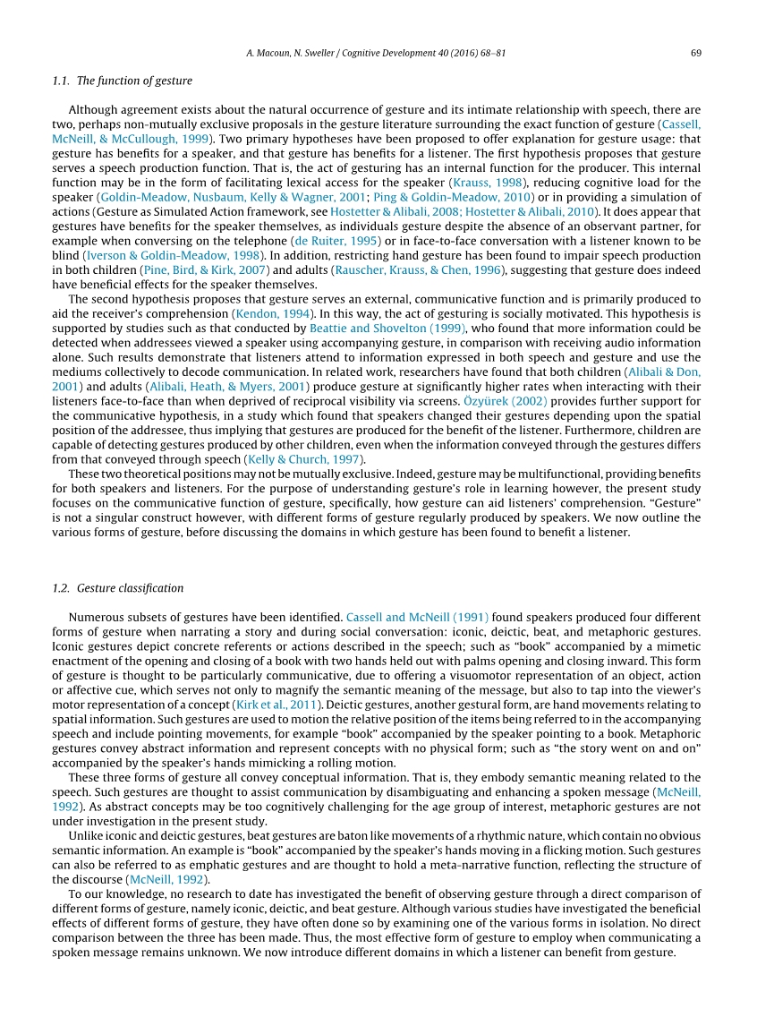 这两个理论立场可能并不相互排斥。的确,手势可能是多功能的,对说话者和听者都有好处。然而,为了了解手势在学习中的作用,目前的研究主要集中在手势的交际功能,特别是手势如何帮助听者理解。然而,“手势”并不是一个单一的结构,说话人经常会做出不同形式的手势。我们现在概述了手势的各种形式,然后讨论手势对听众有益的领域。