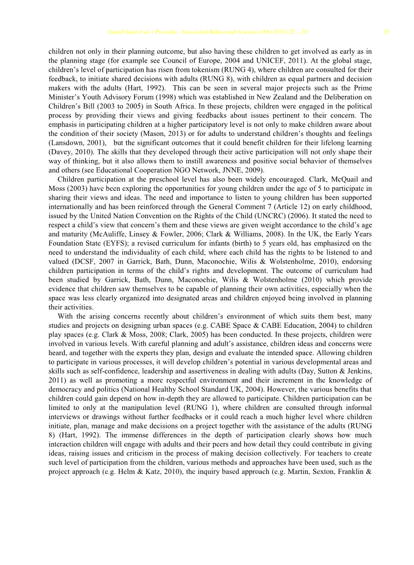学龄前儿童的参与也得到广泛鼓励。Clark, McQuail和Moss(2003)一直在探索5岁以下儿童参与分享观点和想法的机会。倾听儿童的需要和重要性得到了国际上的支持,并在《联合国儿童权利公约》发表的关于儿童早期问题的总评7(第12条)中得到了加强(儿童权利公约)(2006)。它指出了尊重孩子的观点的必要性,而这些观点是根据孩子的年龄和成熟程度来衡量的(McAuliffe, Linsey amp; Fowler, 2006;Clark amp; Williams, 2008)。在英国,建国初期(EYFS);一项针对婴儿(出生)至5岁的修订课程,强调需要了解每个孩子的个性,每个孩子都有被倾听和被重视的权利(DCSF, 2007年,在Garrick, Bath, Dunn, Maconochie, Wilis amp; Wolstenholme, 2010),赞同儿童在儿童权利和发展方面的参与。Garrick, Bath, Dunn, Maconochie, Wilis amp; Wolstenholme(2010)对课程结果进行了研究,结果证明孩子们认为自己有能力规划自己的活动,特别是当空间被不那么清晰地组织成指定区域时,孩子们喜欢参与计划他们的活动。
