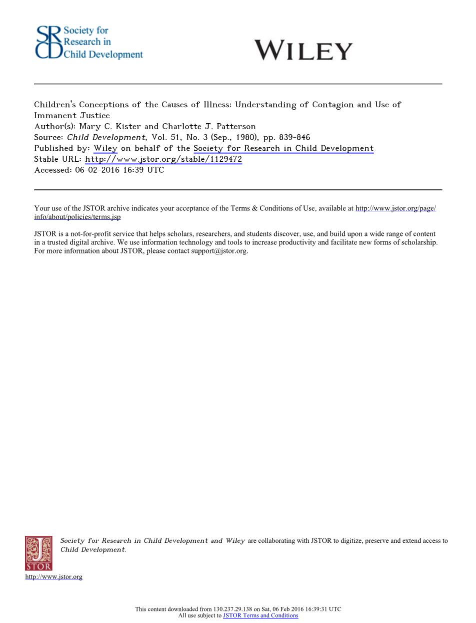 玛丽·C·坎斯特(Kister)和夏洛特·J·帕特森(Charlotte J.)内在:了解传染性和使用内在正义。儿童发展,1980,51,839-846。对4个年级(学龄前,幼儿园,二年级和四年级)的15名健康儿童进行了访谈,以评估他们对传染病的理解以及他们对疾病和事故的直接司法解释。与年龄较大的儿童相比,年龄较小的儿童更有可能将传染概念过度扩展为不适当的疾病(即,非传染性疾病和意外事故),并且不太可能理解人与人之间的距离对传播传染性疾病的可能性的影响。年幼的孩子比年长的孩子更有可能为事件援引内在的司法解释。所有年龄段的孩子都使用内在的司法解释,因此生病的几率比发生事故或不幸的几率高。最后,内在正义的使用反过来又与了解疾病的合理原因有关。即使消除了年龄的影响,孩子们对于传染性疾病使用内在的正义解释仍然是负面的与他们对传染病的理解密切相关。尽管在历史上具有临床意义,儿童对疾病起因的理解很少是严格研究的课题。坎贝尔(Campbell,1975,1978)的一项工作是最近的一个例外,该工作研究了儿童对待常见疾病的态度和定义是否受到母亲的影响。但是,大多数研究关注认知发展影响儿童对疾病成因的理解。