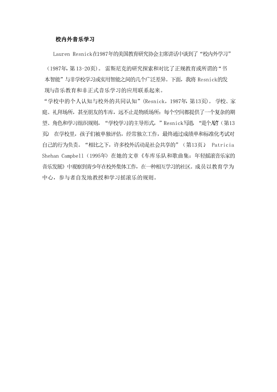 In her 1987 presidential address to the American Educational Research Association, Lauren Resnick looked at 'learning in school and out' (1987, pp. 13-20). Resnicks research explored and contrasted several broad differences between formal education or socalled 'book smarts' and nonschool learning or practical intelligence. Outlined below, I have linked Resnicks findings to applications in music education and informal musical learning. (Italics are added for emphasis.)