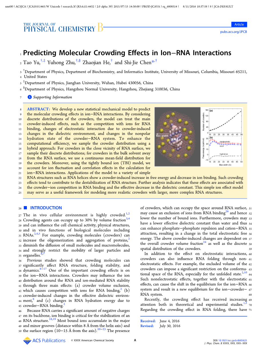 介绍:体内细胞环境非常拥挤1,2。拥挤分子的体积分数可以占到30%3,4,它可以影响细胞的化学活性、物理结构和生物分子的体内功能,包括RNA2,4,5。例如,拥挤分子可以增加蛋白质的寡聚和聚集2,减少小分子和大分子的扩散,并大大限制大颗粒和细胞器的流动性6,7。先前的研究表明,拥挤的分子可以明显影响RNA结构、折叠稳定和动力学特性。8—17 其中一个重要的拥挤效应在离子minus;RNA相互作用中。拥挤分子可能通过三个主要作用影响RNA和离子介导的RNA稳定性的离子分布:(a)拥挤分子体积排斥导致与离子—RNA相互作用的竞争,2 (b)拥挤分子导致有效介电环境的变化,8(c)由于拥挤分子—RNA的相互作用导致RNA水合能变化。2