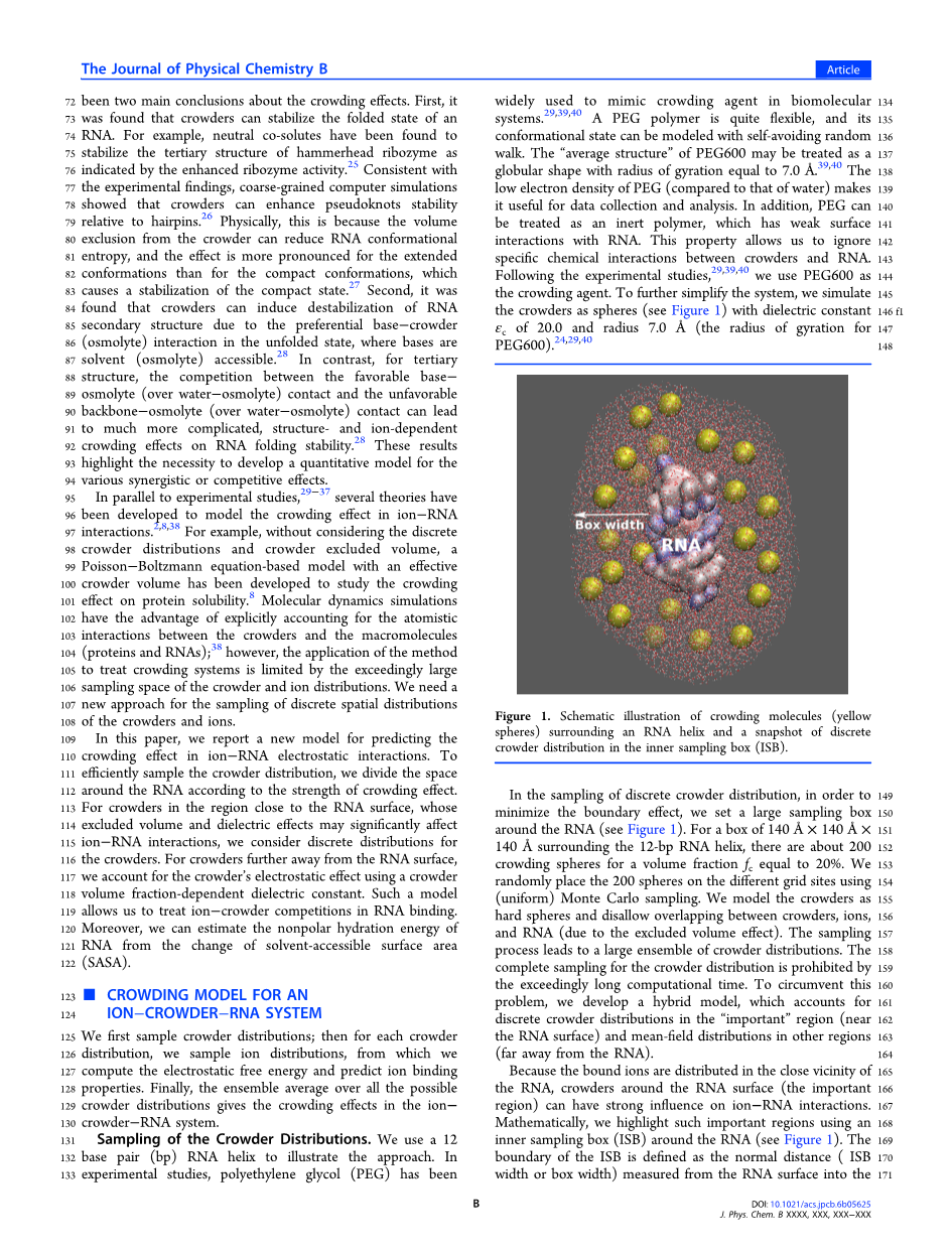 因为RNA在其主链上携带大量的负电荷,所以离子结合对于稳定RNA结构至关重要。18,19 大多数束缚离子在主要和次要的凹槽中聚集(距离在8Aring;以内的螺旋轴)和表面区域(离轴10minus;15Aring; )。20—23拥挤分子的存在会占据RNA表面周围的空间,从RNA结合中排除离子28,导致束缚离子的数量的减少。此外,拥挤分子可能有比水更低的有效介电常数,因此可以提高磷酸-磷酸排斥和阳离子minus;RNA吸引,导致总静电自由能的变化。上述的拥挤分子导致的变化依赖于整体的拥挤分子体积分数以及拥挤分子的离散的空间分布。