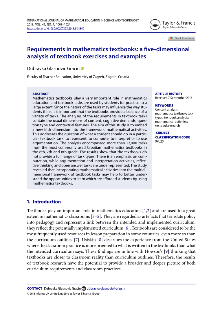 Textbooks play an important role in mathematics education [1,2] and are used to a great extent in mathematics classrooms [3–5]. They are regarded as artefacts that translate policy into pedagogy and represent a link between the intended and implemented curriculum; they reflect the potentially implemented curriculum [6]. Textbooks are considered to be the most frequently used resources in lesson preparation in some countries, even more so than the curriculum outlines [7]. Usiskin [8] describes the experience from the United States where the classroom practice is more oriented to what is written in the textbooks than what the intended curriculum says. These findings are in line with Howsonrsquo;s [9] thinking that textbooks are closer to classroom reality than curriculum outlines. Therefore, the results of textbook research have the potential to provide a broader and deeper picture of both curriculum requirements and classroom practices.