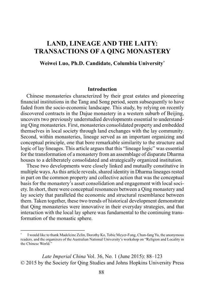 Chinese monasteries characterized by their great estates and pioneering fnancial institutions in the Tang and Song period, seem subsequently to have faded from the socio-economic landscape. This study, by relying on recently discovered contracts in the Dajue monastery in a western suburb of Beijing,uncovers two previously understudied developments essential to understanding Qing monasteries. First, monasteries consolidated property and embedded themselves in local society through land exchanges with the lay community.Second, within monasteries, lineage served as an important organizing and conceptual principle, one that bore remarkable similarity to the structure and logic of lay lineages. This article argues that this 'lineage logic' was essential for the transformation of a monastery from an assemblage of disparate Dharma houses to a deliberately consolidated and strategically organized institution.