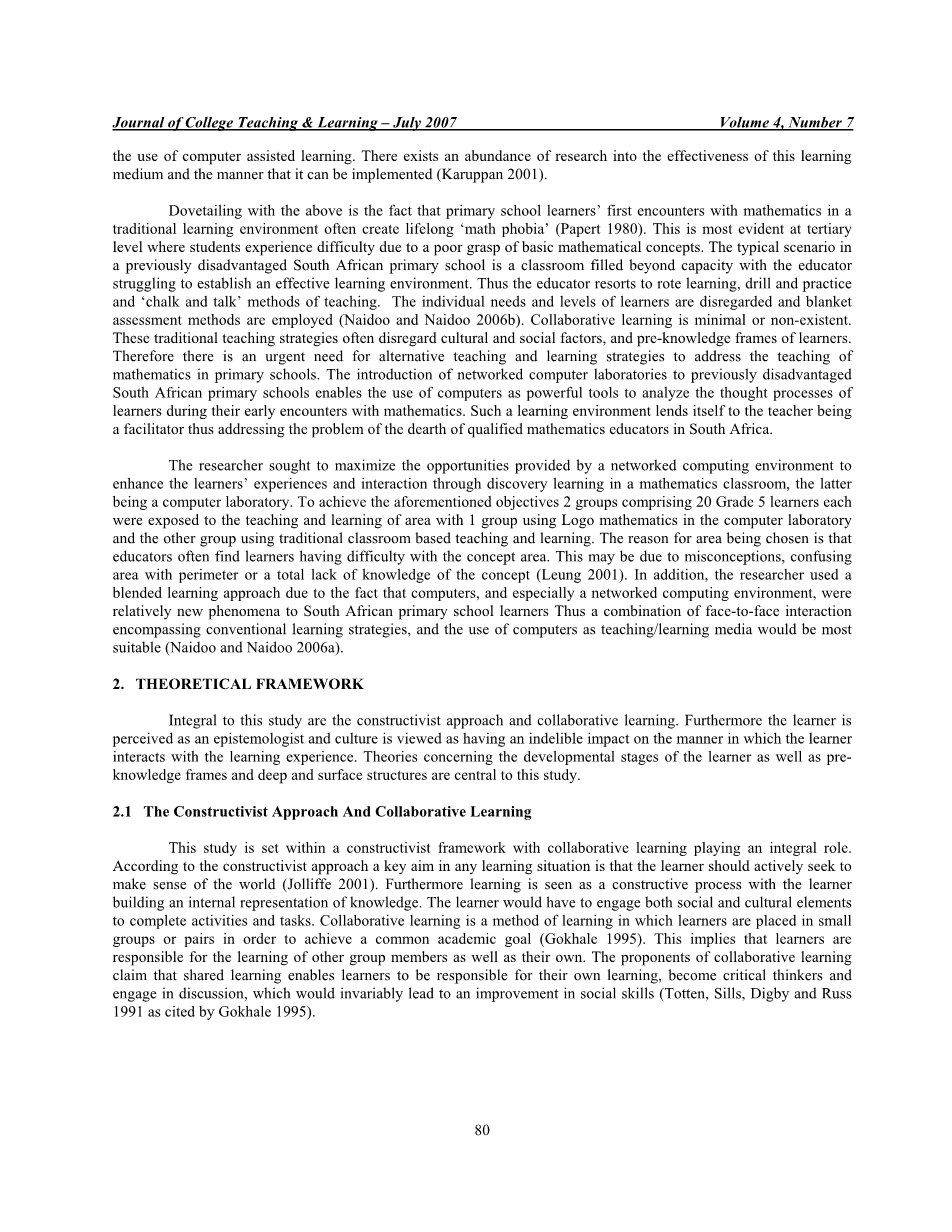研究人员试图最大限度地利用网络计算环境提供的机会,通过在数学教室中进行发现学习,增强学习者的体验和互动,后者是计算机实验室。为实现上述目标,由20名五年级学习者组成的2组学生分别接触该地区的教学和学习,1组在计算机实验室使用徽标数学,另一组使用传统的课堂教学;学习。选择区域的原因是教育工作者经常发现学习者在概念领域有困难。这可能是由于误解、与周边混淆的区域或完全不了解这一概念(leung,2001年)。此外,研究人员还采用了混合学习的方法,因为计算机,特别是网络计算环境,对南非小学生来说是比较新的现象,因此面部与面部的结合。
