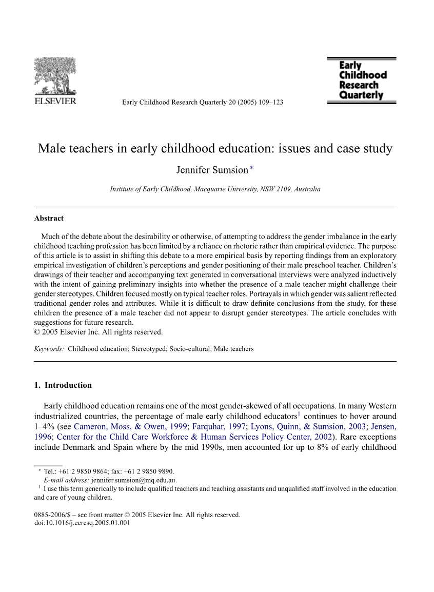 幼儿教育仍然是所有职业中性别最偏向的教育之一。在许多西方工业化国家,男性幼儿教育 者的比例1 继续徘徊在1-4%左右(见卡梅伦,摩斯,欧文,1999岁;Farquhar,1997年;里昂, 奎因,萨默斯,2003;詹森 1996; 儿童保育劳动力和人类服务政策中心,2002年).罕见的例外 包括丹麦和西班牙,到20世纪90年代中期,男性占幼儿期的8%