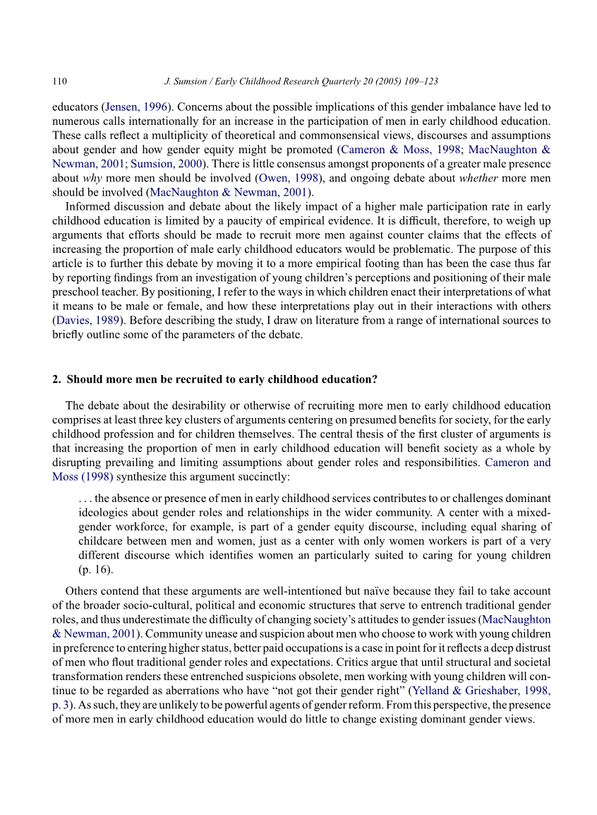教育工作者(Jensen,1996)。对这种性别不平衡可能产生的影响的担忧导致国际上多次呼吁 增加男子参与幼儿教育。这些呼吁反映了多种理论和常识观点,关于性别的话语和假设以及如 何促进性别平等(卡梅伦和莫斯,1998; 麦克诺顿 纽曼,2001;Sumsion,2000)。男性存在的 支持者之间几乎没有达成共识,为什么应该让更多的男性参与其中(欧文,1998)以及关于是 否应该让更多男性参与的持续辩论(MacNaughton&Newman,2001)。 关于男性更高参与率对幼儿教育可能产生的影响的知情讨论和辩论受到缺乏经验证据的限制。 因此,很难权衡一些论点,即应该努力招募更多的男性,以反对增加男性早期教育者比例的影 响会产生问题的反诉。本文的目的是通过报告幼儿对其男性幼儿教师的看法和定位的调查结果, 进一步推动这一辩论,将其转变为比迄今为止更为经验的立足点。通过定位,我指的是儿童如 何解释男性或女性的意义,以及这些解释在与他人的互动中如何发挥作用(戴维斯,1989年). 在描述这项研究之前,我借鉴了一系列国际资料来源,简要概述了辩论的一些参数。