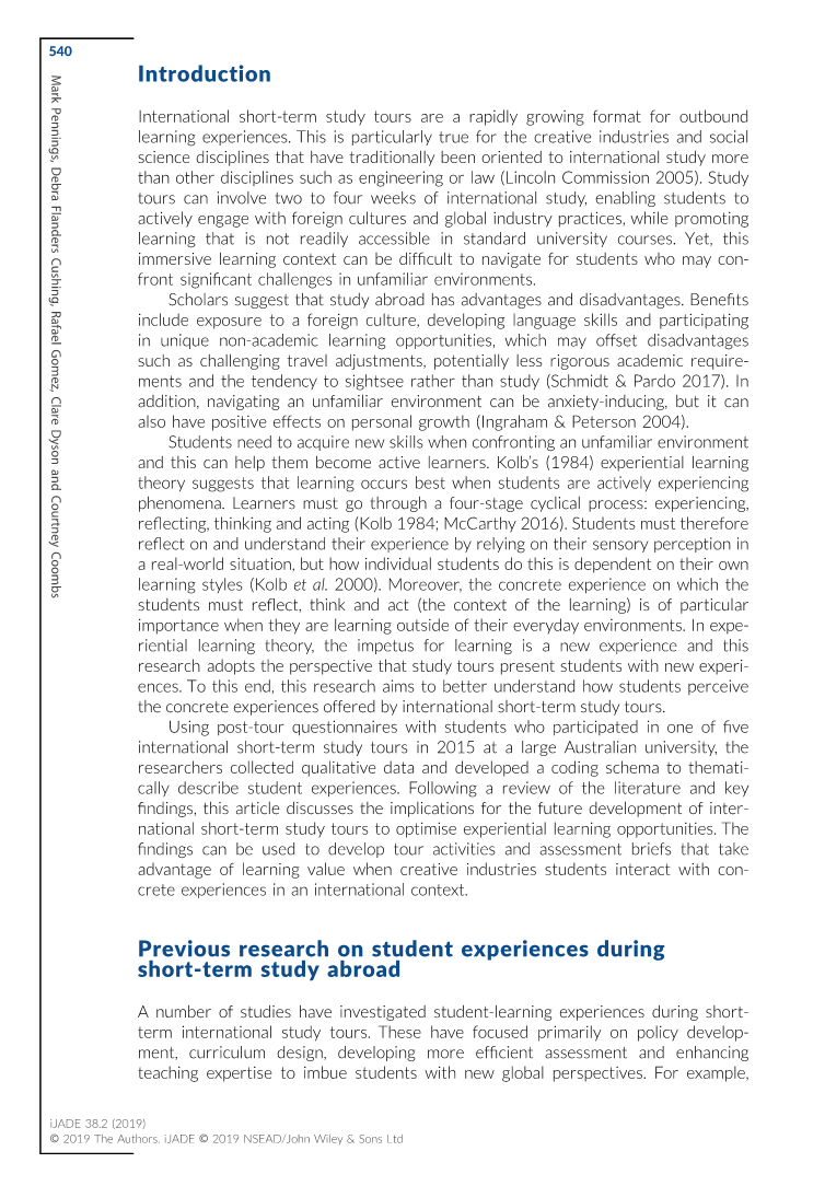 学生在面对陌生的环境时需要掌握新的技能,这可以帮助他们成为积极的学习者。科尔布(1984)的经验学习理论认为,当学生积极体验现象时,学习效果最好。学习者必须经历四个阶段的循环过程:体验、反思、思考和行动(Kolb 1984;McCarthy 2016)。因此,学生必须通过在现实世界中依赖他们的感官感知来反思和理解他们的经验,但学生个体如何做到这一点取决于他们自己的学习风格(Kolb等人,2002年)。2000年)。此外,当学生在日常环境之外学习时,他们必须反思、思考和行动的具体经验(学习的背景)尤其重要。在体验式学习理论中,学习动力是一种新的体验,本研究采用游学为学生呈现新体验的视角。为此,本研究旨在了解学生如何看待国际短期游学所提供的具体经验。