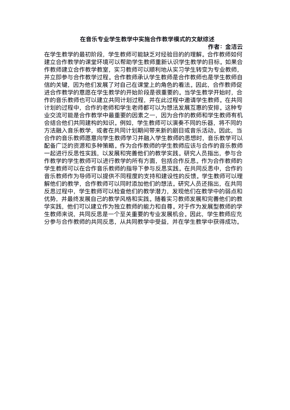 在音乐专业学生教学中实施合作教学模式的文献综述外文翻译资料 2023-01-19 09:52:49 英语原文共 1 页,剩余内容已隐藏,支付完成后下载完整资料 英语译文共 1 页,剩余内容已隐藏,支付完成后下载完整资料 资料编号:[423357],资料为PDF文档或Word文档,PDF文档可免费转换为Word 原文和译文剩余内容已隐藏,您需要先支付 30元 才能查看原文和译文全部内容!立即支付 发小红书推广免费获取该资料资格。点击链接进入获取推广文案即可: Ai一键组稿 | 降AI率 | 降重复率 | 论文一键排版 PREVIOUS NEXT 您可能感兴趣的文章 音乐启发训练分析外文翻译资料 古筝史外文翻译资料 从序列看五声性——中国当代音乐中不同传统的整合外文翻译资料 浅析新疆歌曲《曲蔓地》的演唱风格及技巧分析外文翻译资料 从戏曲到谭盾的中国戏曲打击乐外文翻译资料 我们时代的音乐教学:学生音乐教师对音乐教育、教师教育和成为教师的思考外文翻译资料 我们时代的音乐教学:学生音乐教师对音乐教育、教师教育和成为教师的思考外文翻译资料 莫扎特的降E大调小提琴协奏曲外文翻译资料 文化视域下古筝艺术表演技法的传承与创新研究外文翻译资料 文化视角下古筝表演艺术的传承与创新研究外文翻译资料