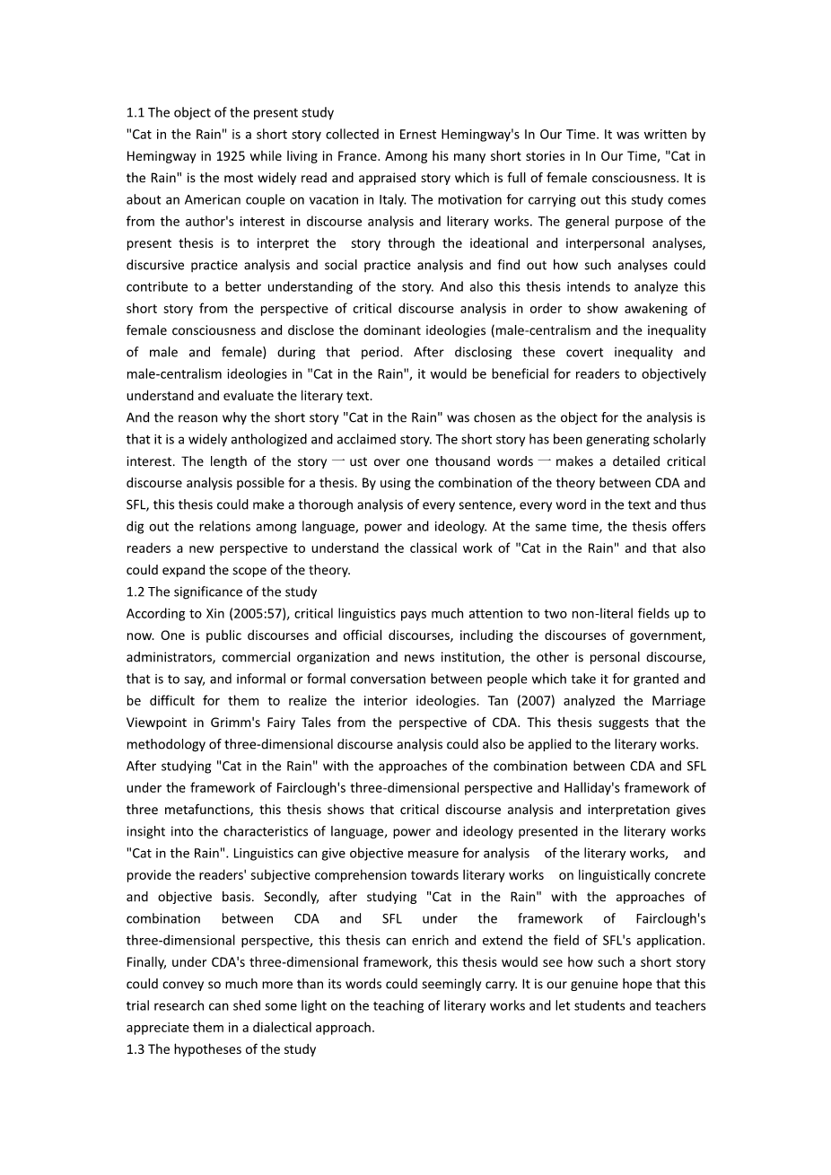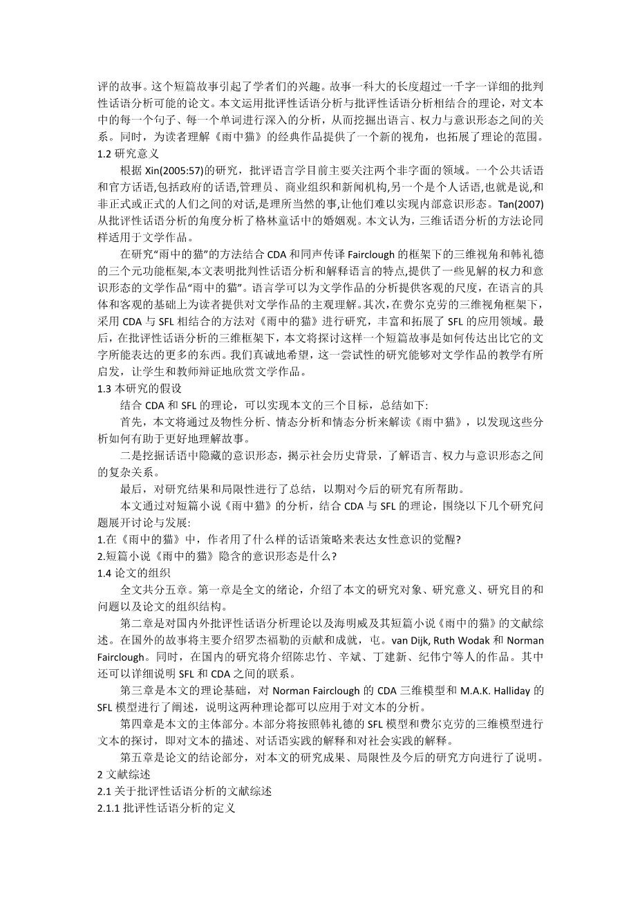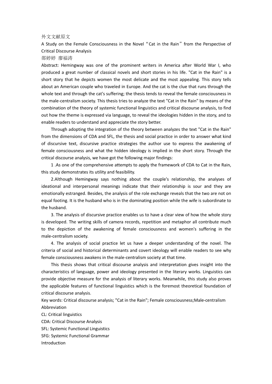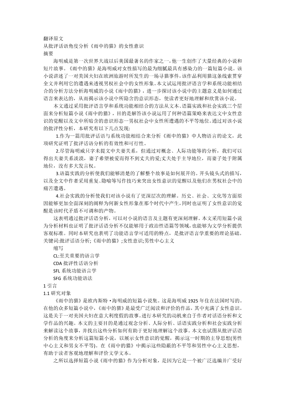 从批评话语角度分析《雨中的猫》的女性意识外文翻译资料