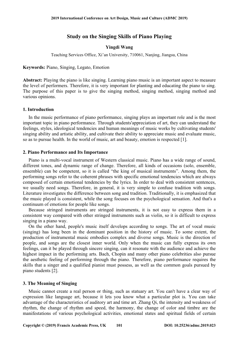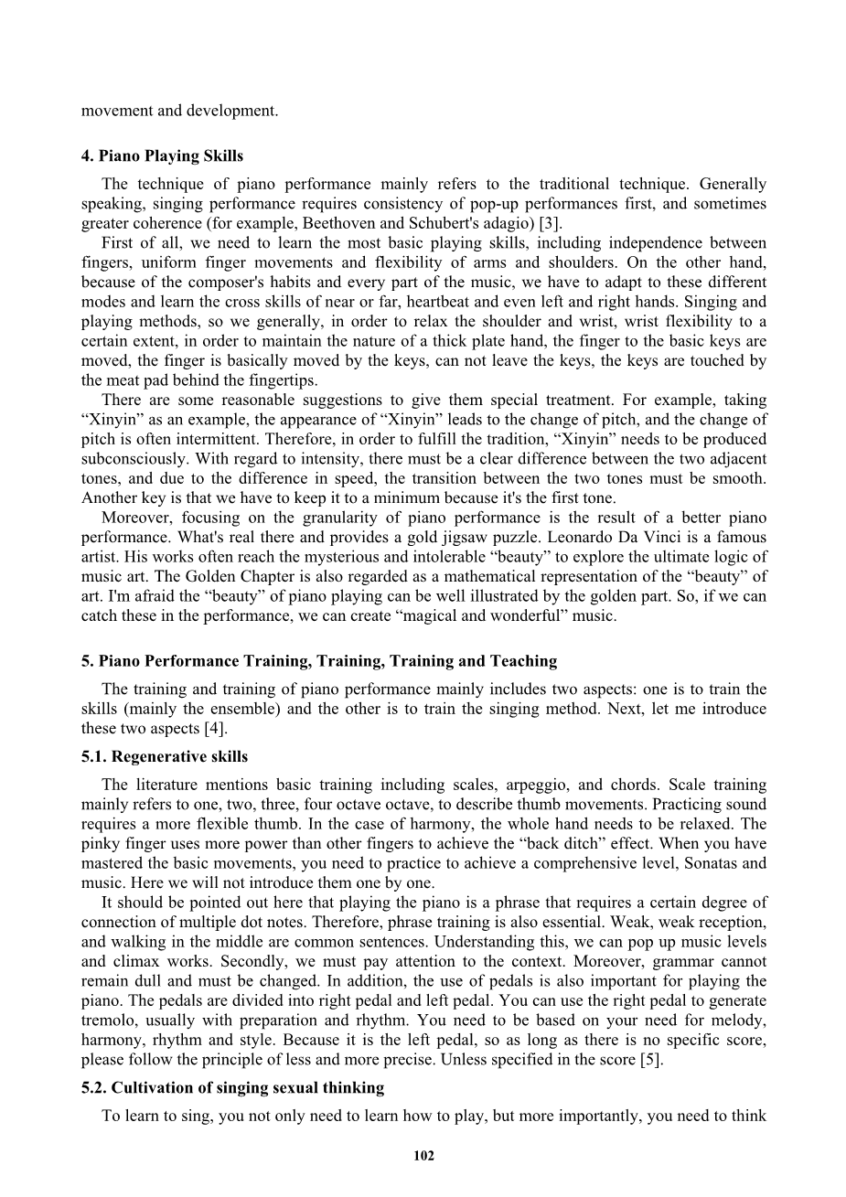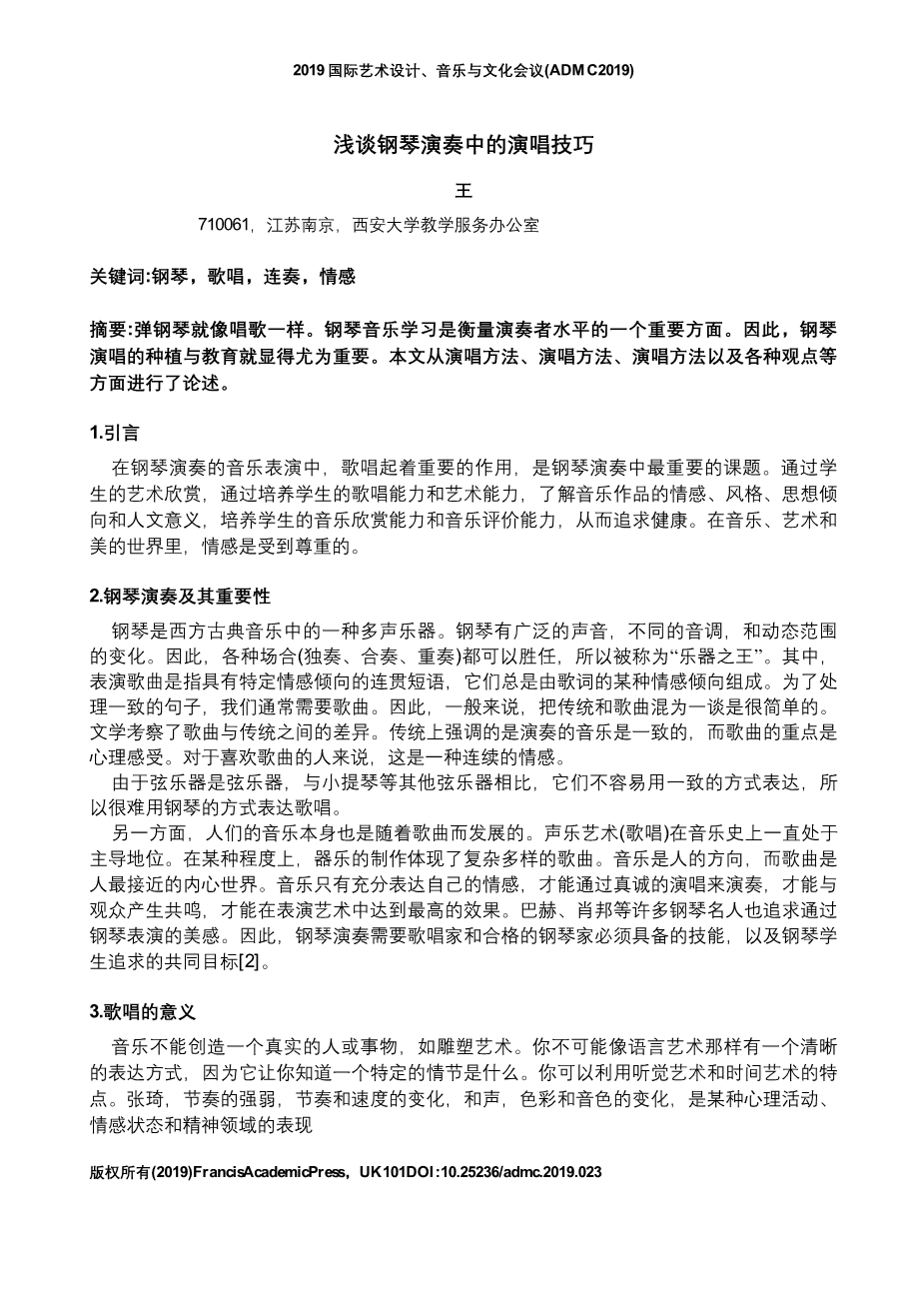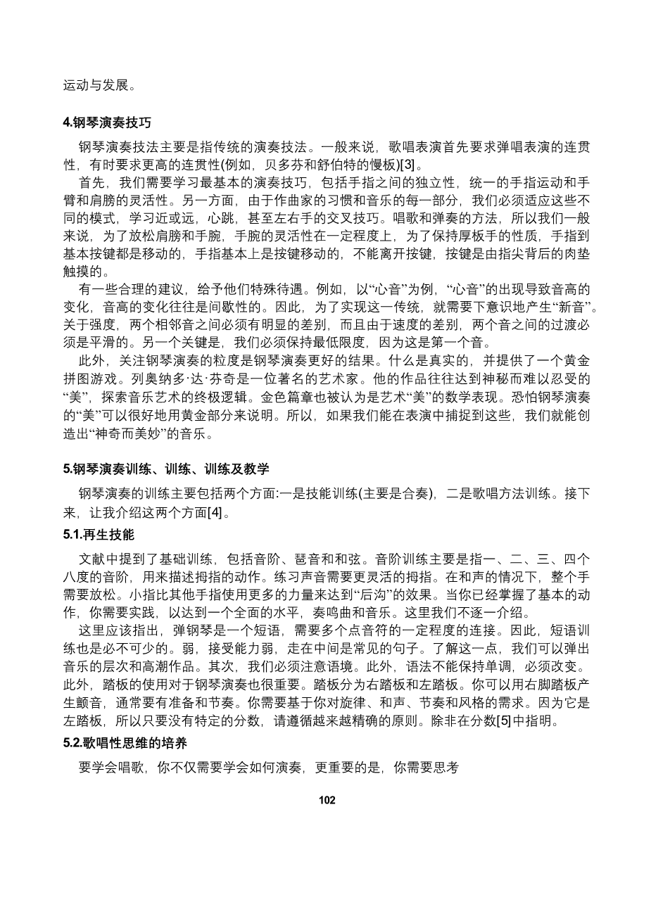 浅谈钢琴演奏中的演唱技巧外文翻译资料 2023-02-03 11:23:10 英语原文共 4 页,剩余内容已隐藏,支付完成后下载完整资料 英语译文共 4 页,剩余内容已隐藏,支付完成后下载完整资料 资料编号:[417571],资料为PDF文档或Word文档,PDF文档可免费转换为Word 原文和译文剩余内容已隐藏,您需要先支付 30元 才能查看原文和译文全部内容!立即支付 发小红书推广免费获取该资料资格。点击链接进入获取推广文案即可: Ai一键组稿 | 降AI率 | 降重复率 | 论文一键排版 PREVIOUS NEXT 您可能感兴趣的文章 音乐启发训练分析外文翻译资料 古筝史外文翻译资料 从序列看五声性——中国当代音乐中不同传统的整合外文翻译资料 浅析新疆歌曲《曲蔓地》的演唱风格及技巧分析外文翻译资料 从戏曲到谭盾的中国戏曲打击乐外文翻译资料 我们时代的音乐教学:学生音乐教师对音乐教育、教师教育和成为教师的思考外文翻译资料 我们时代的音乐教学:学生音乐教师对音乐教育、教师教育和成为教师的思考外文翻译资料 莫扎特的降E大调小提琴协奏曲外文翻译资料 文化视域下古筝艺术表演技法的传承与创新研究外文翻译资料 文化视角下古筝表演艺术的传承与创新研究外文翻译资料