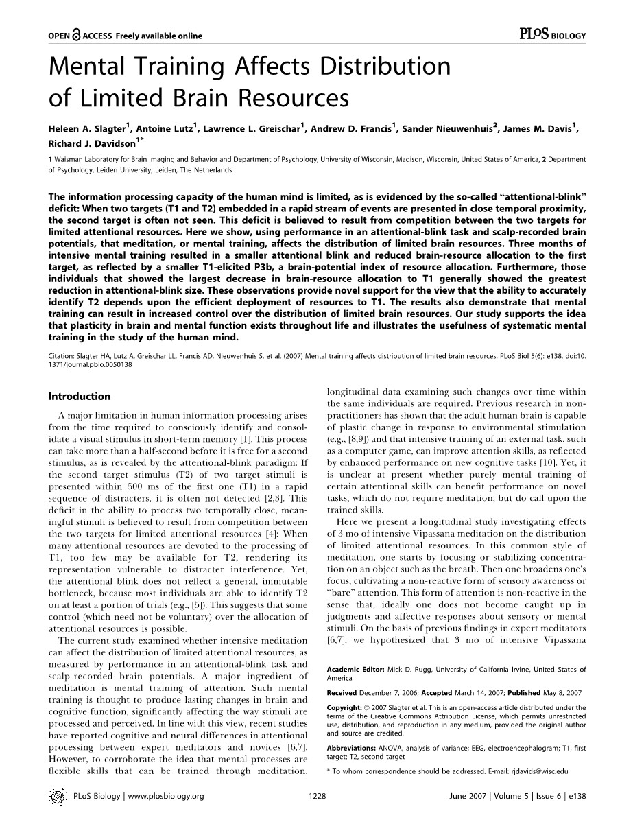 HeleenA.Slagter1,AntoineLutz1,LawrenceL.Greischar1,AndrewD.Francis1,SanderNieuwenhuis2,JamesM.Davis1,RichardJ.Davidson1* 1WaismanLaboratoryforBrainImagingandBehaviorandDepartmentofPsychology,UniversityofWisconsin,Madison,Wisconsin,UnitedStatesofAmerica,2DepartmentofPsychology,LeidenUniversity,Leiden,TheNetherlands