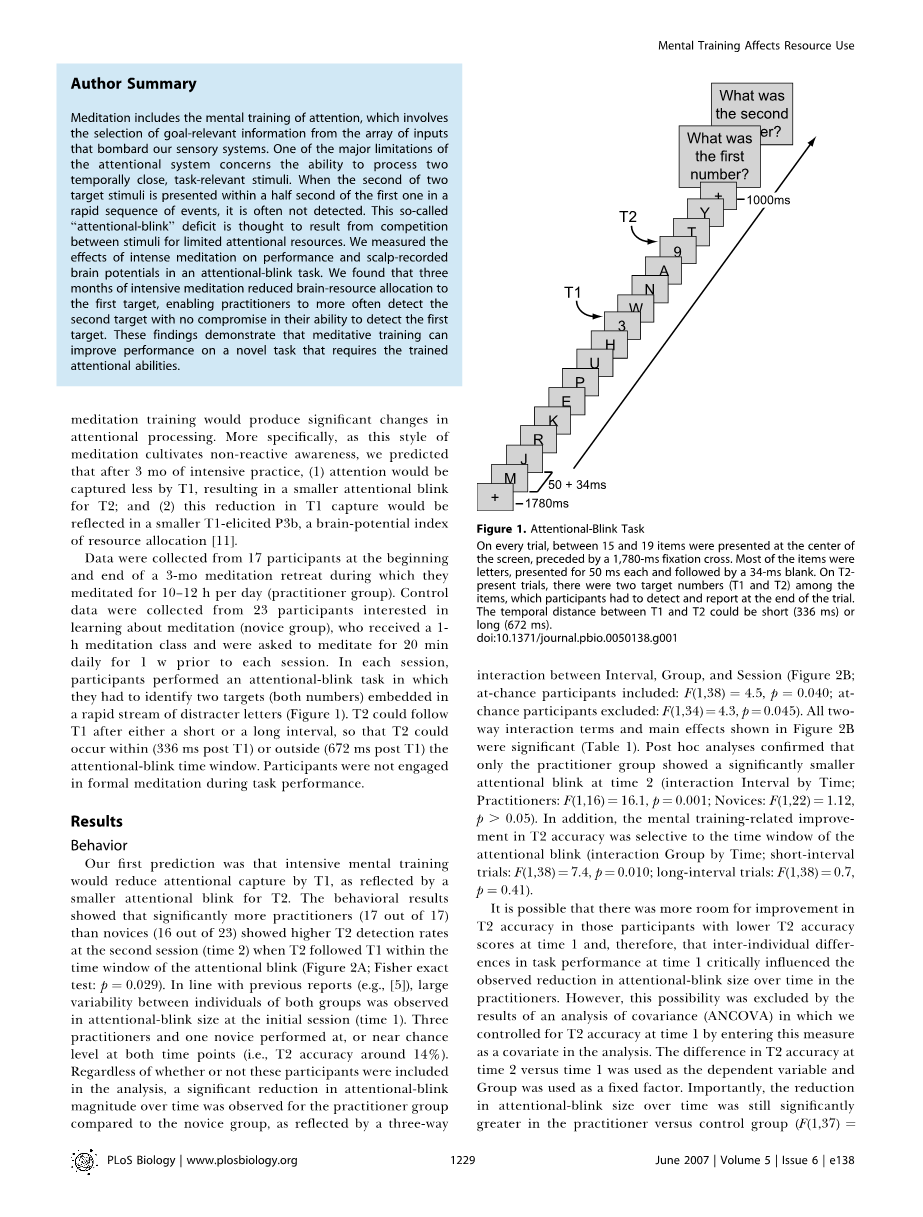人类信息处理的一个主要限制来自于在短期记忆[1]中有意识地识别和巩固视觉刺激所需的时间。这个过程可能需要超过半秒之前是免费的第二个刺激,揭示的注意力眨眼范式:如 果第二个目标刺激(T2) 的两个目标刺激在500ms的第一个(T1) 快速序列的干扰,通常不发现[2,3]。这种赤字的能力处理两个暂时关闭,有意义的刺激被认为是由于两个目标之间的竞争有限的注意资源[4]:当许多注意力资源致力于T1 的处理,太少可能为T2,呈现其表示容易受到干扰的干扰。然而,注意 力眨眼并没有反映出一个普遍的、不可改变的瓶颈,因为大多数人能够在至少一部分试验中识别t2(e.g., [5]).这表明, 对注意力资源的分配进行一些控制(不需要是自愿的)是可能的。