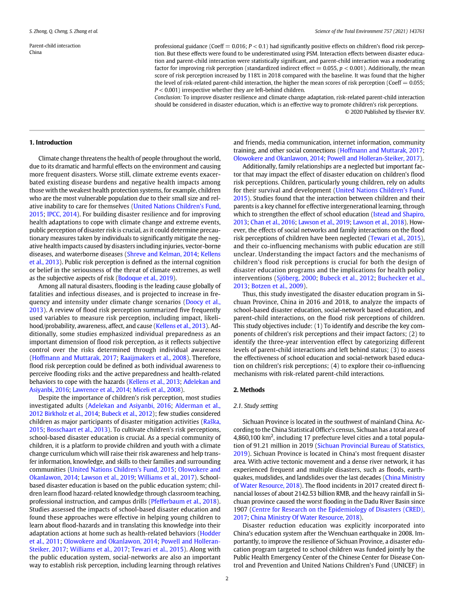 2008年汶川地震后,减灾教育被明确纳入中国教育体系,重要的是,为了提高四川省的抗灾能力,2016年,由中国疾病预防控制中心公共卫生应急中心和联合国儿童基金会(UNICEF)联合资助,在什邡市、岳西县和泸县三个试点地区开展了针对在校儿童的灾害教育项目,由于山区和密集的河流网,这些县面临着频繁的洪水、泥石流和山体滑坡的风险。然而,在四川,有很大一部分父母在大城市外出打工,因此有大量的孩子留守儿童由老人抚养。因此,四川省的这一灾害教育项目可以通过以下途径提供一个切入点:哪些政策制定者和教育管理者能够理解如何减轻灾害风险,增强健康对气候的适应能力极端。